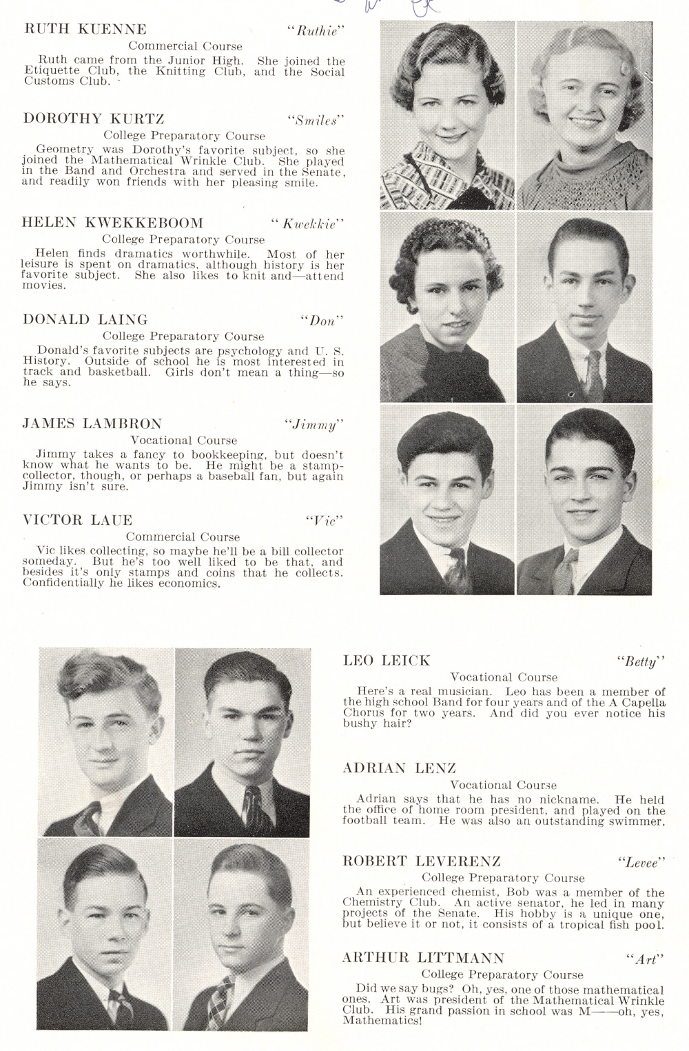 1936 Sheboygan High School, Page 41: Ruth Kuenne, Dorothy Kurtz, Helen Kwekkeboom, Donald Laing, James Lambron, Victor Laue, Leo Leick, Adrian Lenz, Robert Leverenz, Arthur Littmann.