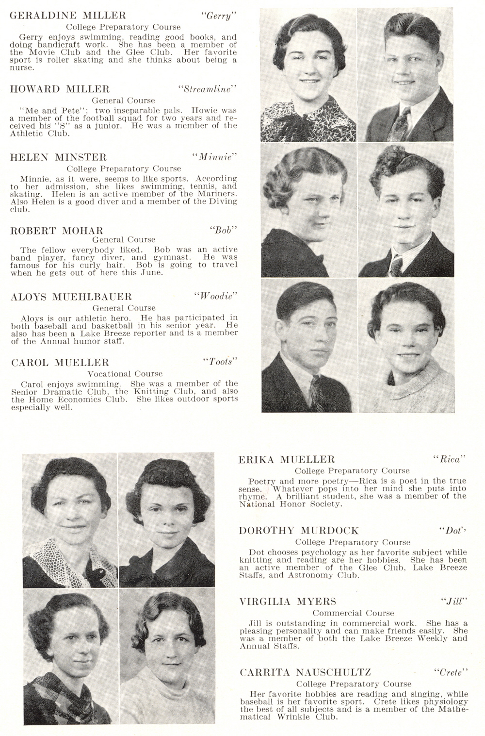 1936 Sheboygan High School, Page 45: Geraldine Miller, Howard Miller, Helen Minster, Robert Mohar, Aloys Muehlbauer, Carol Mueller, Erika Mueller, Dorothy Murdock, Virginia Myers, Carrita Nauschultz.