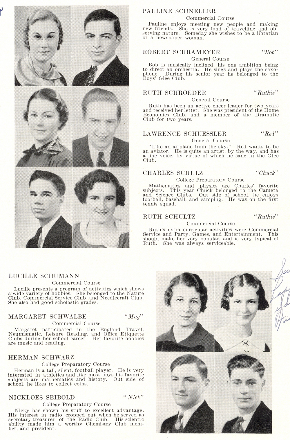 1936 Sheboygan High School, Page 52: Pauline Schneller, Robert Schrameyer, Ruth Schroeder, Lawrence Schuessler, Charles Schulz, Ruth Schulz, Lucille Schumann, Margaret Schwalbe, Herman Schwarz, Nickloes Seibold.