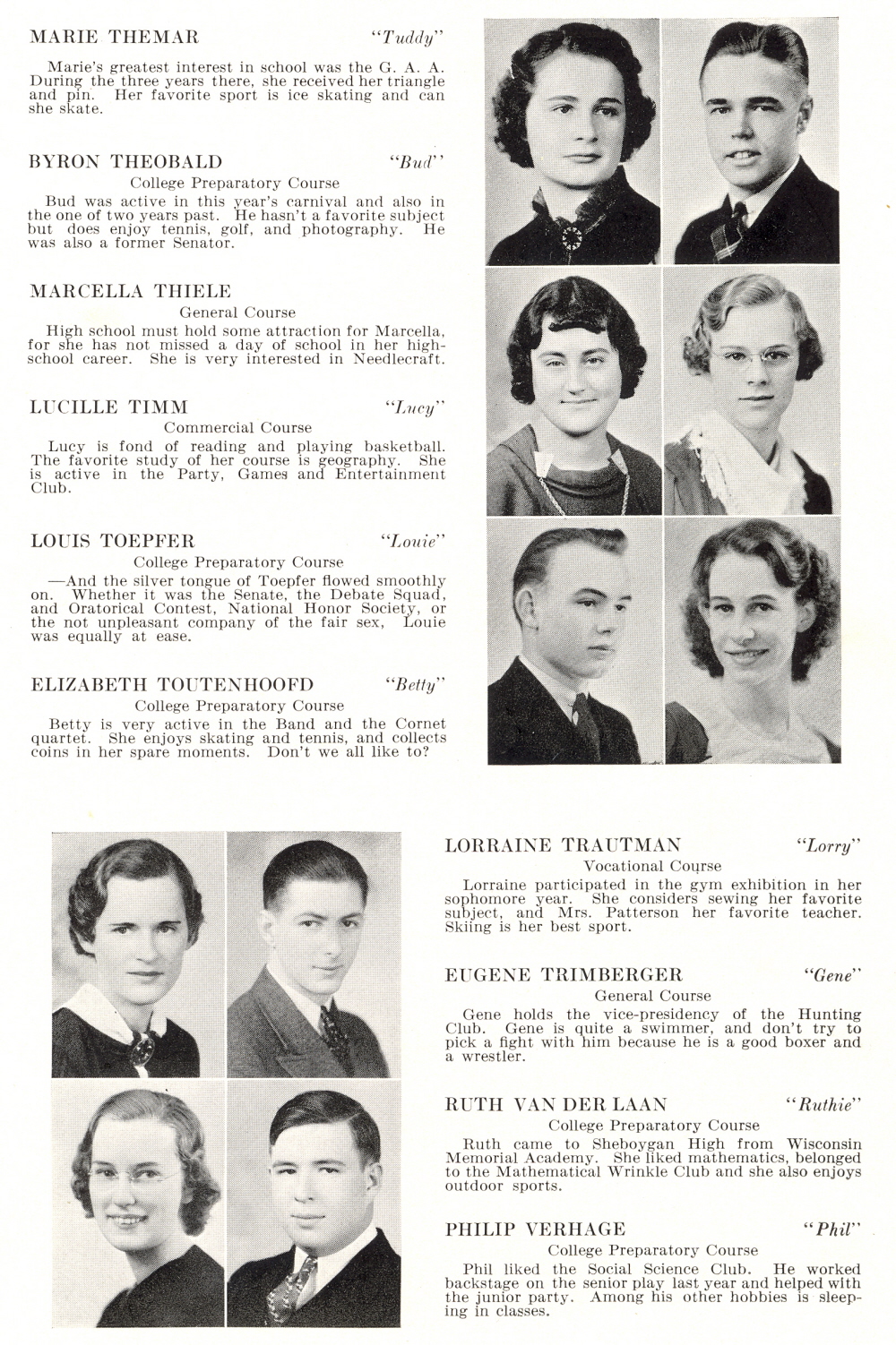 1936 Sheboygan High School, Page 57: Marie Themar, Byron Theobald, Marcella Thiele, Lucille Timm, Louis Toepfer, Elizabeth Toutenhoofd, Lorraine Trautman, Eugene Trimberger, Ruth Van Der Laan, Philip Verhage.