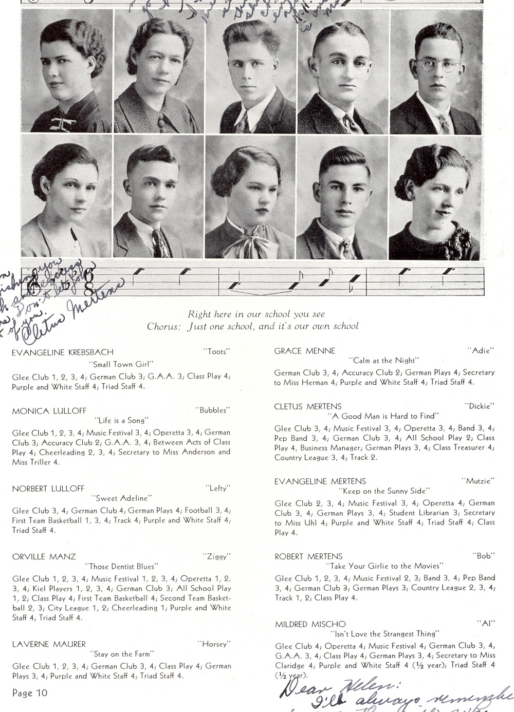 1937 Kiel High School, Page 10: Evangeline Krebsbach, Monica Lulloff, Norbert Lulloff, Orville Manz, La Verne Maurer, Grace Menne, Cletus Mertens, Evangeline Mertens, Robert Mertens, Mildred Mischo.