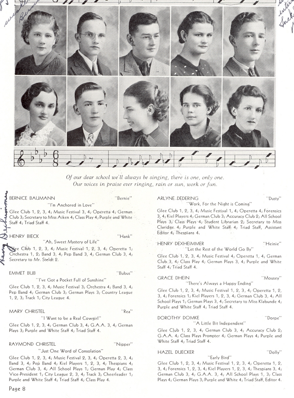 1937 Kiel High School, Page 8: Bernice Baumann, Henry Bieck, Emmet Bub, Mary Christel, Raymond Christel, Arlyne Dedering, Henry Dexheimmer, Grace Chein, Dorothy Domke, Hazel Duecker.
