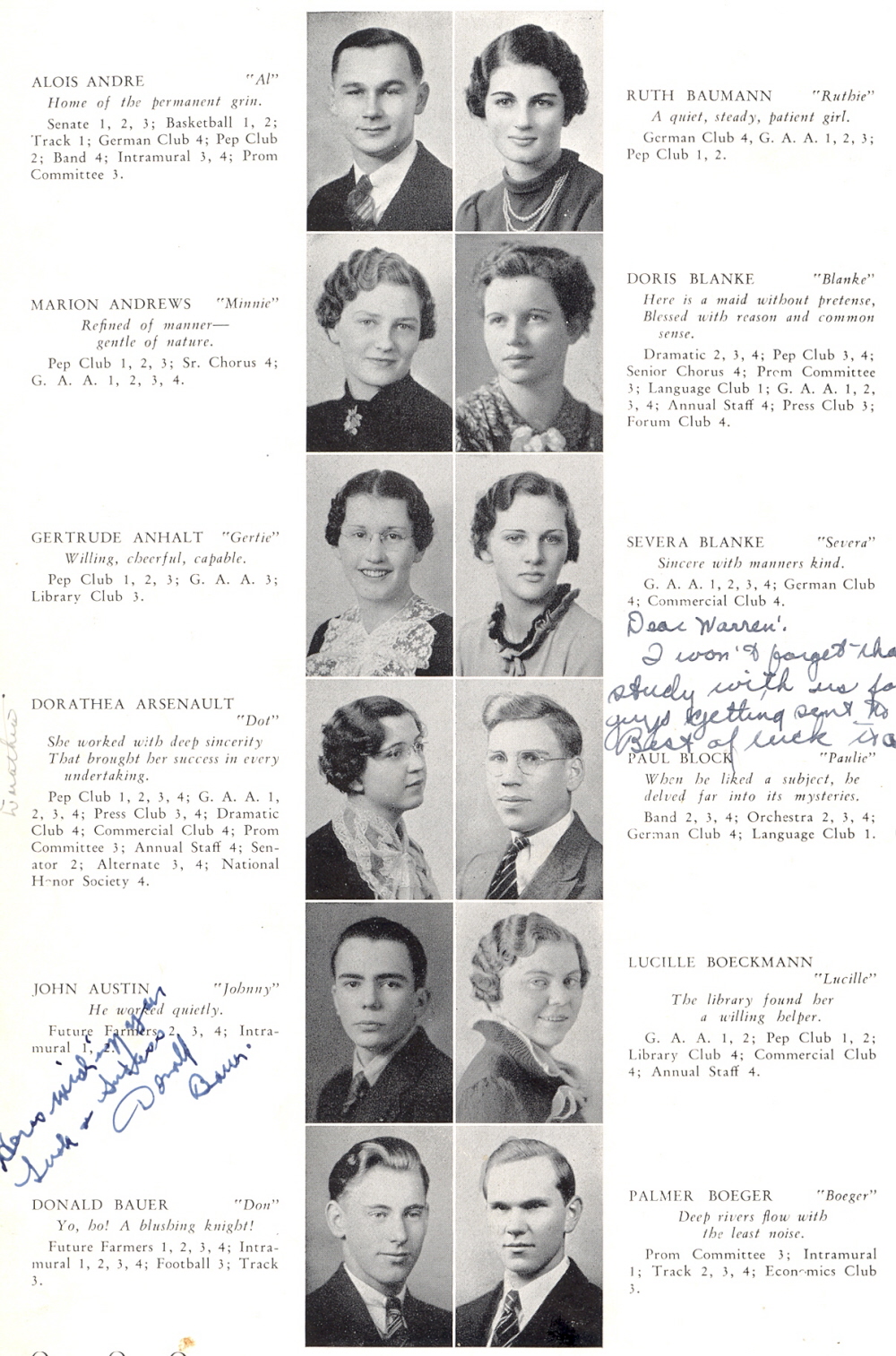 1937 Plymouth High School, Page 10: Alois Andre, Marion Andrews, Gertrude Anhalt, Dorathea Arsenault, John Austin, Donald Bauer, Ruth Baumann, Doris Blanke, Severa Blanke, Paul Block, Lucille Boeckmann, Palmer Boeger.
