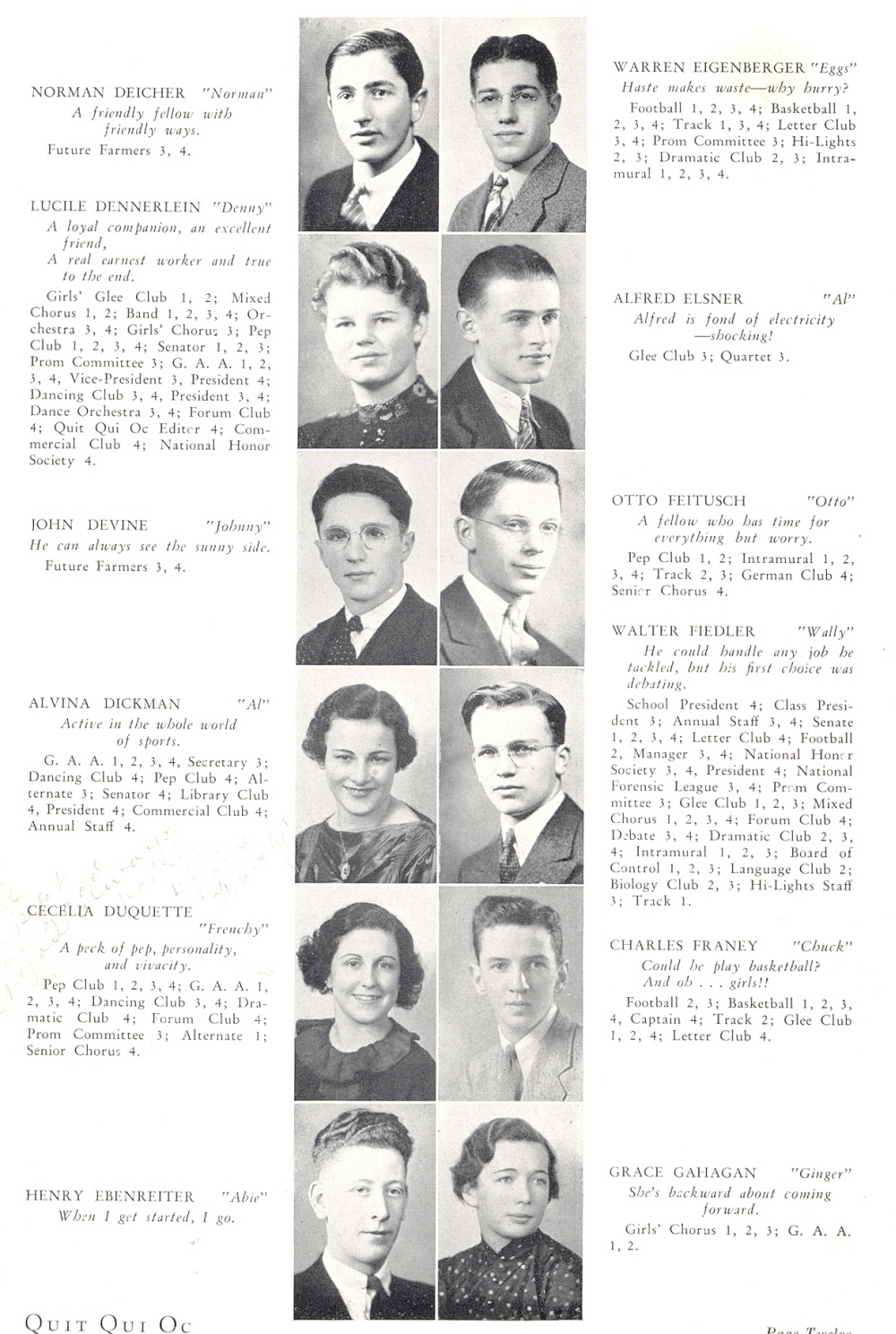 1937 Plymouth High School, Page 12: Norman Deicher, Lucille Dennerlein, John Devine, Alvina Dickman, Cecelia Duquette, Henry Ebenreiter, Warren Eigenberger, Alfred Elsner, Otto Feitusch, Walter Fiedler, Charles Franey, Grace Gahagan.
