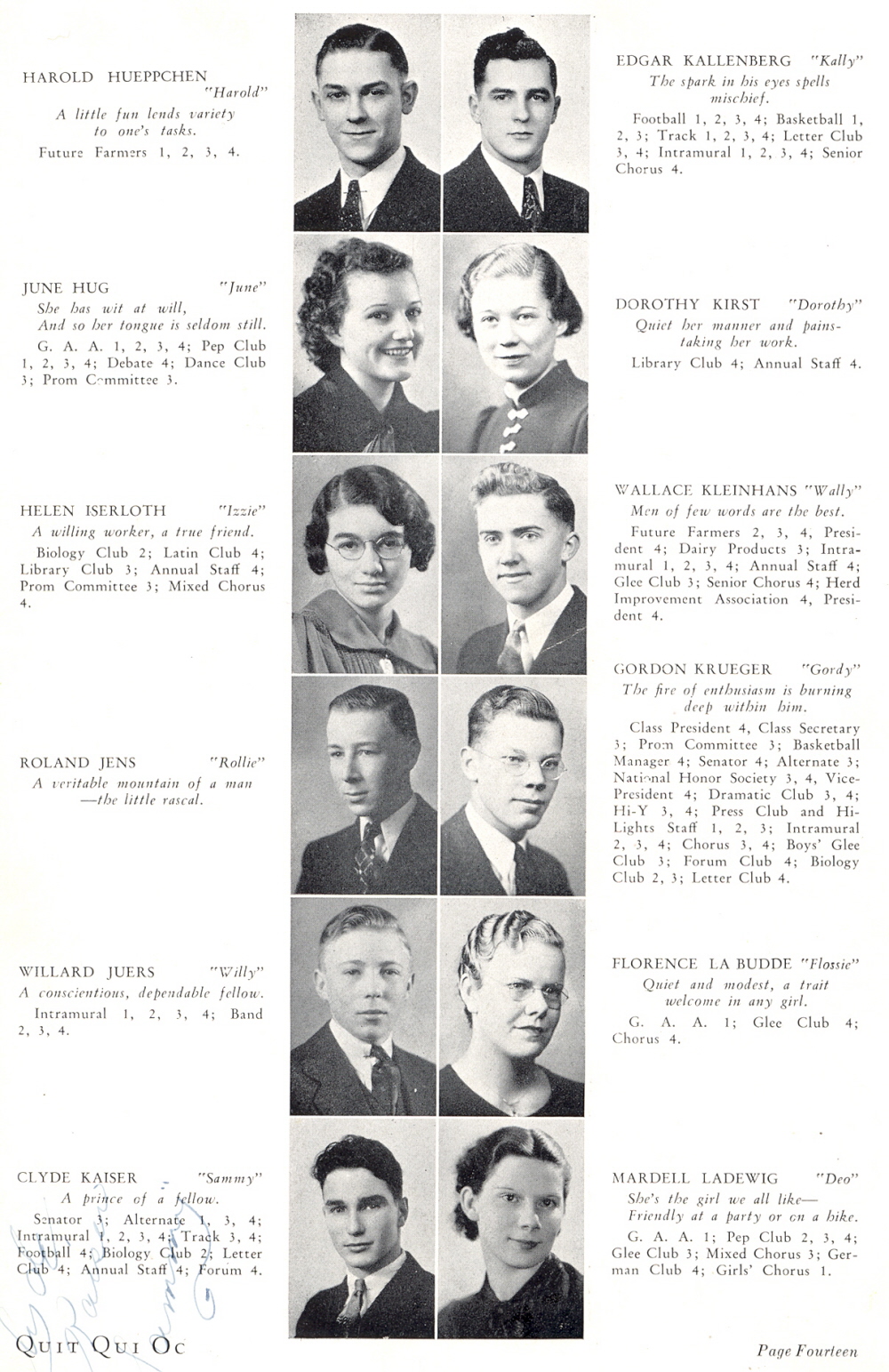 1937 Plymouth High School, Page 14: Harold Hueppchen, June Hug, Helen Iserloth, Roland Jens, Willard Juers, Clyde Kaiser, Edgar Kallenberg, Dorothy Kirst, Wallace Kleinhans, Gordon Krueger, Florence La Budde, Mardell Ladewig.