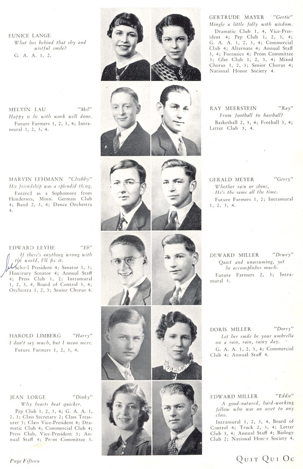 1937 Plymouth High School, Page 15: Eunice Lange, Melvin Lau, Marvin Lehmann, Edward Leyhe, Harold Limberg, Jean Lorge, Gertrude Mayer, Ray Meerstein, Gerald Meyer, Deward Miller, Doris Miller, Edward Miller.
