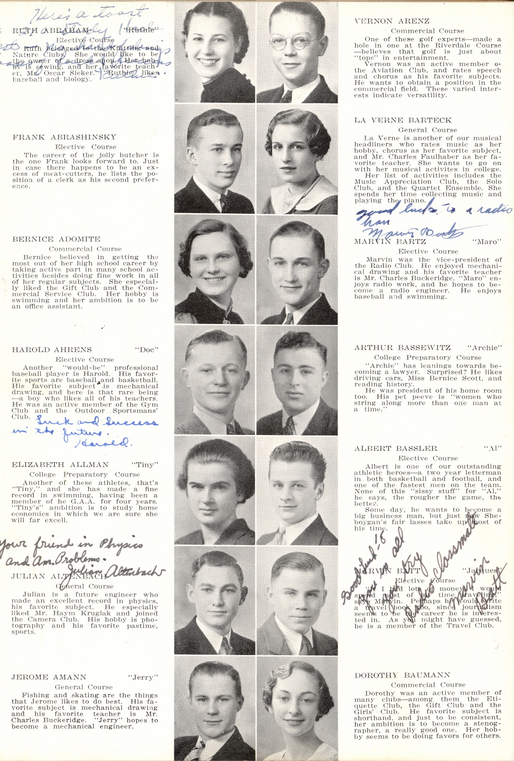 1937 Sheboygan High School, Page 1: Ruth Abraham, Fank Abrashinsky, Bernice Adomite, Harold Ahrens, Elizabeth Allman, Julian Altenbach, Jerome Amann, Vernon Arenz, La Verne Barteck, Marvin Bartz, Arthur Bassewitz, Albert Bassler, Marvin Batt, Dorothy Baumann.