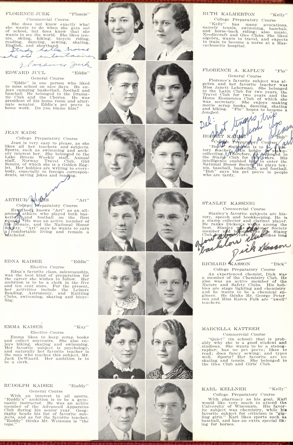 1937 Sheboygan High School, Page 13: Florence Jurk, Edward Juul, Jean Kade, Arthur Kaems, Edna Kaiser, Emma Kaiser, Rudolph Kaiser, Ruth Kalmerton, Florence A. Kaplun, Robert Karbe, Stanley Kashnig, Richard Kasson, Marcella Kattreh, Karl Kellner.