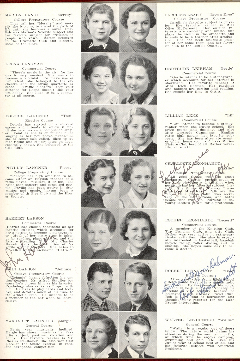 1937 Sheboygan High School, Page 16: Marion Lange, Leona Langman, Dolores Langner, Phyllis Langner, Harriet Larson, John Larson, Margaret Laudner, Caoline Leahy, Gertrude Leibham, Lillian Lenz, Charlotte Leonhardt, Esther Leonhardt, Robert Leonhardt, Walter Levchenko.