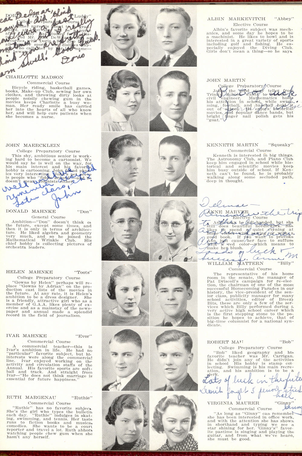 1937 Sheboygan High School, Page 18: Doris Lutz, Charlotte Madson, John Maercklein, Donald Mahnke, Helen Mahnke, Ivar Mahnke, Ruth Margenau, Albin Markevitch, John Martin, Kenneth Martin, Anne Marver, William Mattern, Robert Mau, Virginia Maurer.
