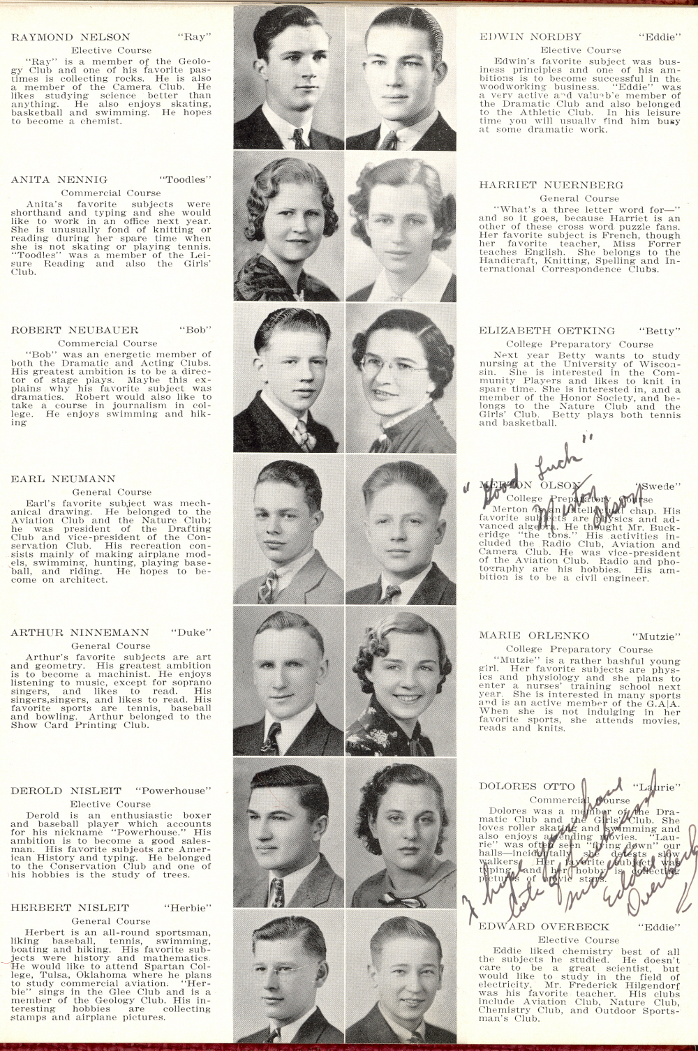1937 Sheboygan High School, Page 21: Raymond Nelson, Anita Nennig, Robert Neubauer, Earl Neumann, Arthur Ninnemann, Derold Nisleit, Herbert Nisleit, Edwin Nordby, Harriet Nuernberg, Elizabeth Oetking, Merton Olson, Marie Orlenko, Dolores Otto, Edward Overbeck.
