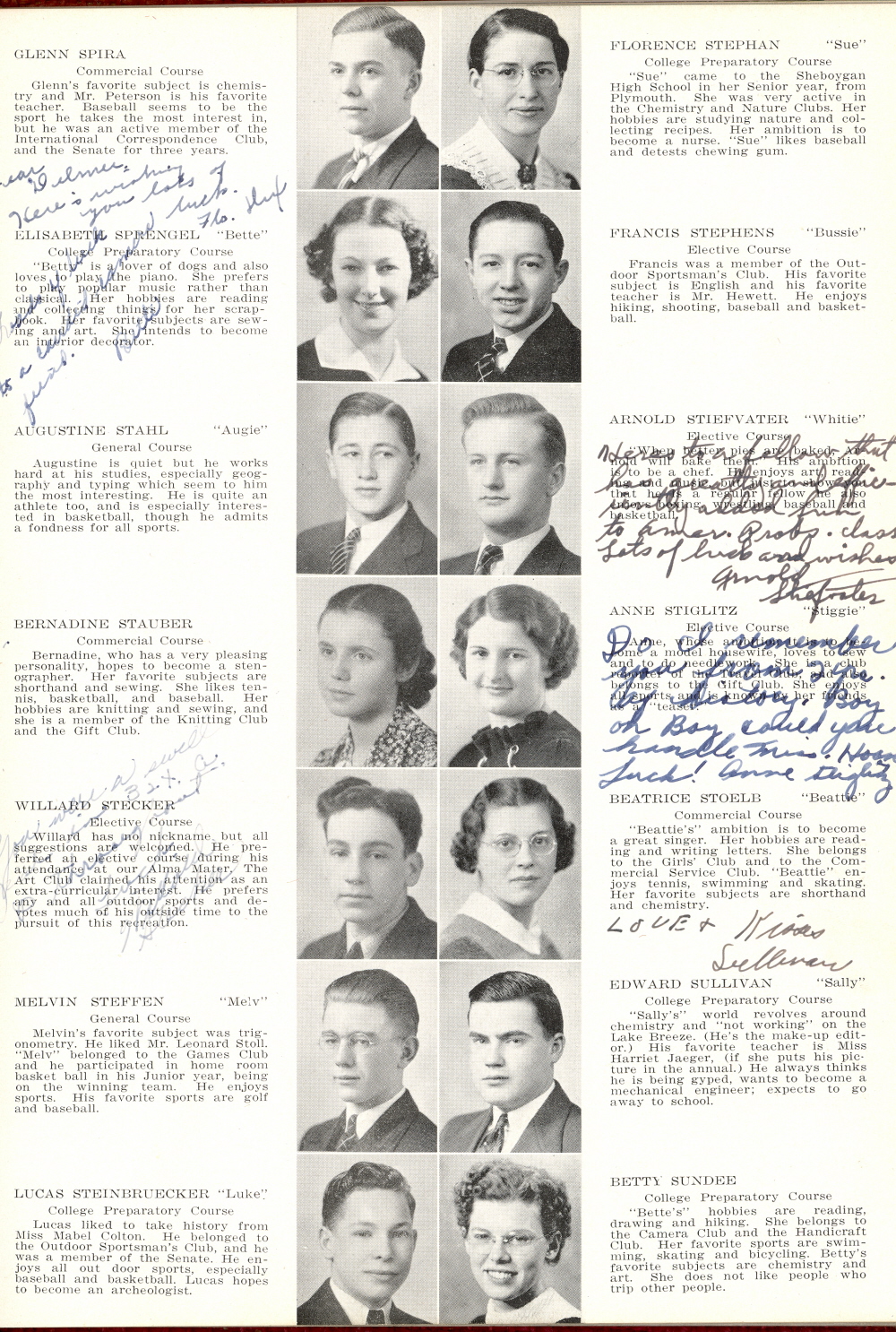 1937 Sheboygan High School, Page 28: Glenn Spira, Elisabeth Sprengel, Augustine Stahl, Bernadine Stauber, Willard Stecker, Melvin Steffen, Lucas Steinbruecker, Florence Stephan, Francis Stephens, Arnold Steifvater, Anne Stiglitz, Beatrice Stoelb, Edward Sullivan, Betty Sundee.