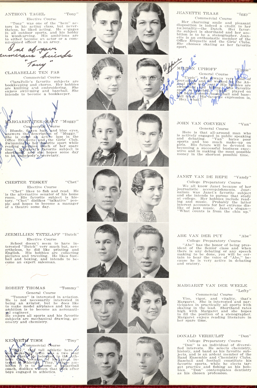 1937 Sheboygan High School, Page 29: Anthony Tagel, Clarabelle Ten Pas, Margaret Ter Maat, Chester Teskey, Jermillien Tetzlaff, Robert Thomas, Kenneth Timm, Jeanette Traas, Milton Uphoff, John Van Coevern, Janet Van De Repe, Abe Van Der Puy, Margaret Van Der Weele, Donald Verhulst.