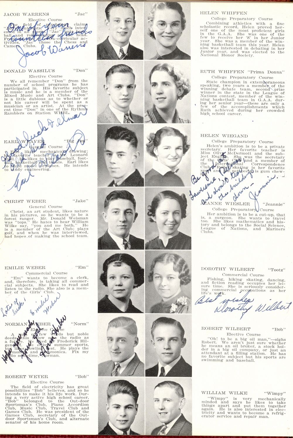 1937 Sheboygan High School, Page 31: Jacob Warrens, Donald Wassilus, Earl Weaver, Christ Weber, Emilie Weber, Norman Weber, Robert Weyer, Helen Whiffen, Ruth Whiffen, Helen Wiegand, Jeanne Wiesler, Dorothy Wilbert, Robert Wilbert, William Wilke.