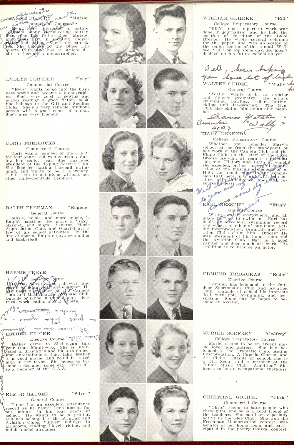 1937 Sheboygan High School, Page 8: Jeanne Fleury, Evelyn Forster, Doris Fredricks, Ralph Freeman, Harris Freye, Esther Fricke, Elmer Gauger, William Gehrke, Walter Geibel, Mary Gerend, Earl Gessert, Edmund Girdaukas, Muriel Godfrey, Christine Goebel.