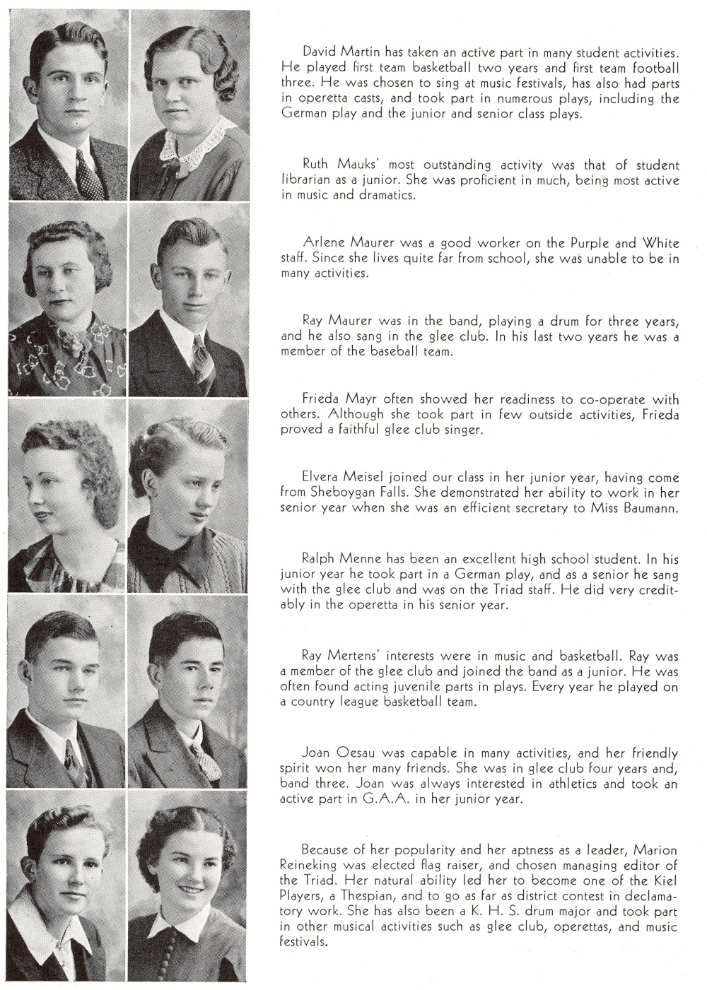 1938 Kiel High School, Page 16: David Martin, Ruth Mauk, Arlene Maurer, Ray Maure,r Frieda Mayr, Elvera Meisel, Ralph Menne, Ray Mertens, Joan Oesau, Marion Reineking.