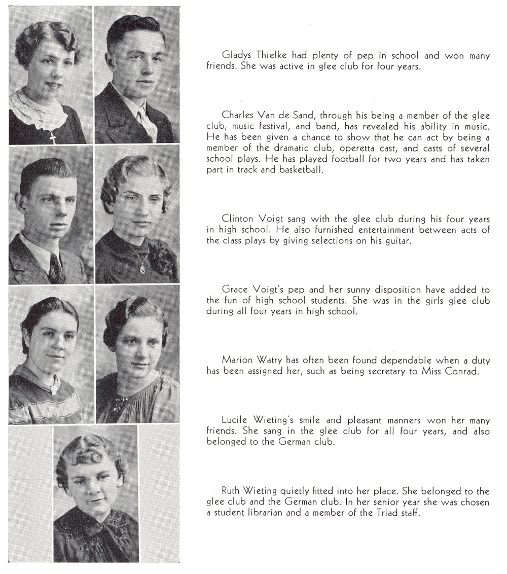 1938 Kiel High School, Page 18: Gladys Thielke, Charles Van de Sand, Clinton Voigt, Grace Voigt, Marion Watry, Lucile Wieting, Ruth Wieting.