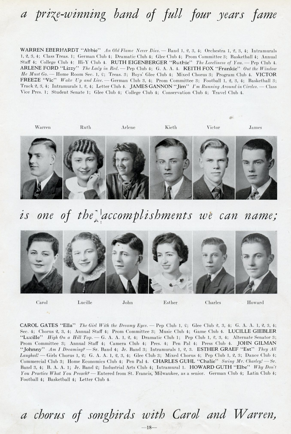 1938 Plymouth High School Yearbook Page 18: Warren Eberhardt, Ruth Eigenberger, Arlene Ford, Keith Fox, Victor Freeze, James Gannon, Carol Gates, Lucille Giebler, John Gilman, Esther Graef, Charles Guhl, Howard Guth.