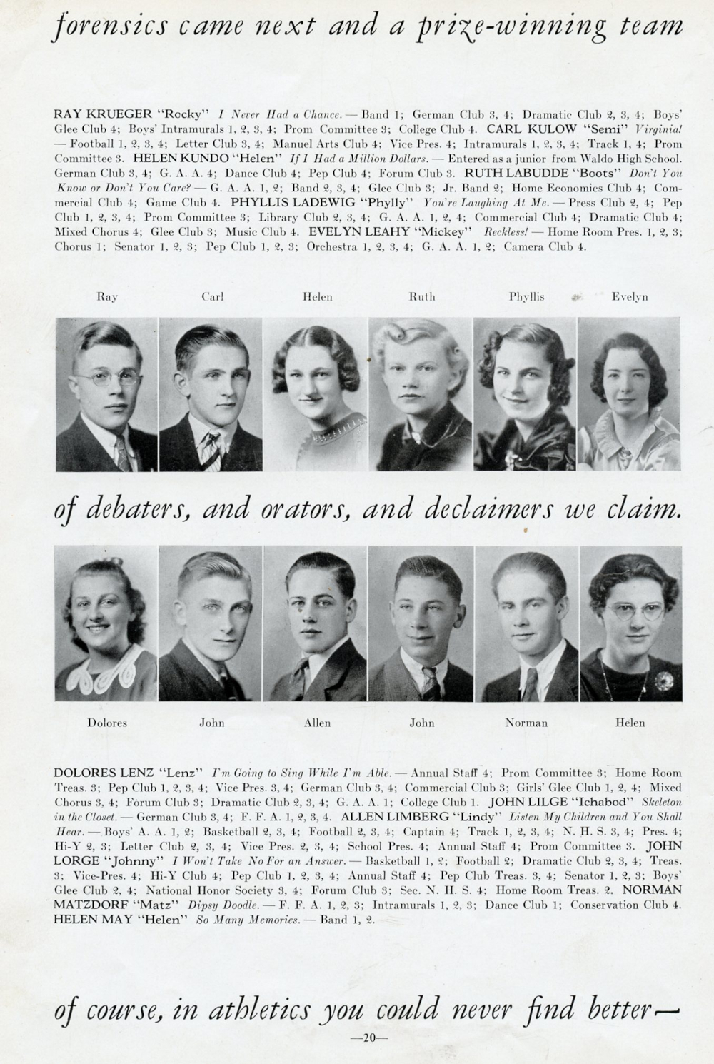 1938 Plymouth High School Yearbook Page 20: Ray Krueger, Carl Kulow, Helen Kundo, Ruth Labudde, Phyllis Ladewig, Evelyn Leahy, Dolores Lenz, John Lilge, Allen Limberg, John Lorge, Norman Matzdorf, Helen May.
