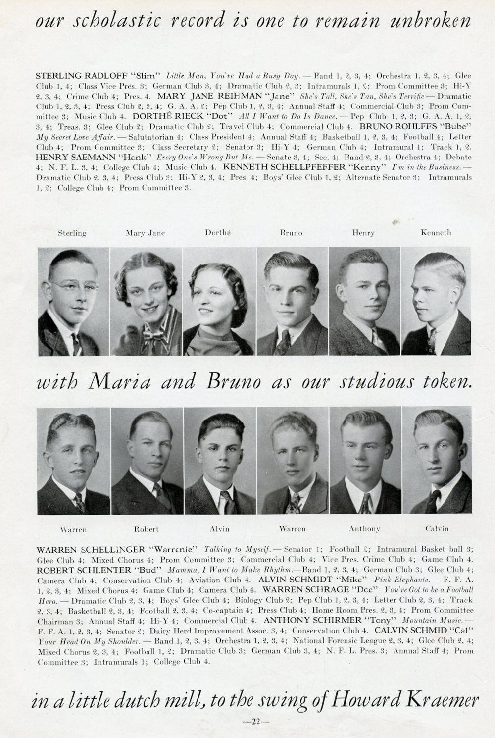 1938 Plymouth High School Yearbook Page 22: Sterling Radloff, Mary Jane Reifman, Dorthe Rieck, Bruno Rohlffs, Henry Saemann, Kenneth Schellpfeffer, Warren Schellinger, Robert Schlenter, Alvin Schmidt, Warren Schrage, Anthony Schirmer, Calvin Schmid.