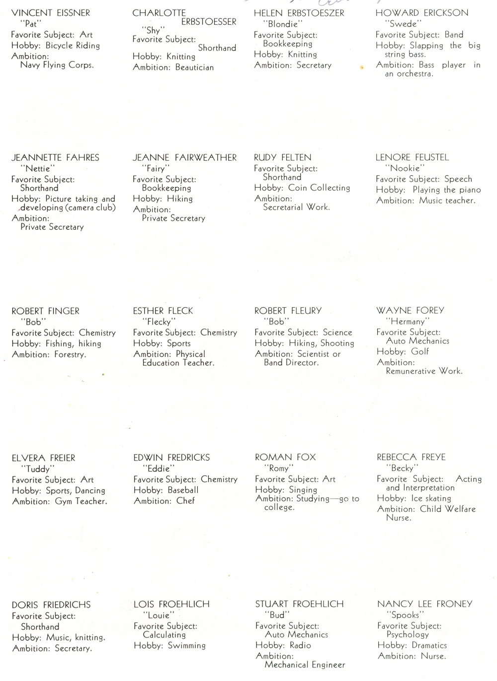1938 Sheboygan High School, Pages 34 and 35: Vincent Eissner, Charlotte Erbstoesser, Helen Erbstoeszer, Howard Erickson, Jeannette Fahres, Jeanne Fairweather, Rudy Felton, Lenore Feustel, Robert Finger, Esther Fleck, Robert Fleury, Wayne Forey, Elvera Freier, Edwin Fredricks, Roman Fox, Rebecca Freye, Doris Friedrichs, Lois Froehlich, Stuart Froehlich, Nancy Froney.