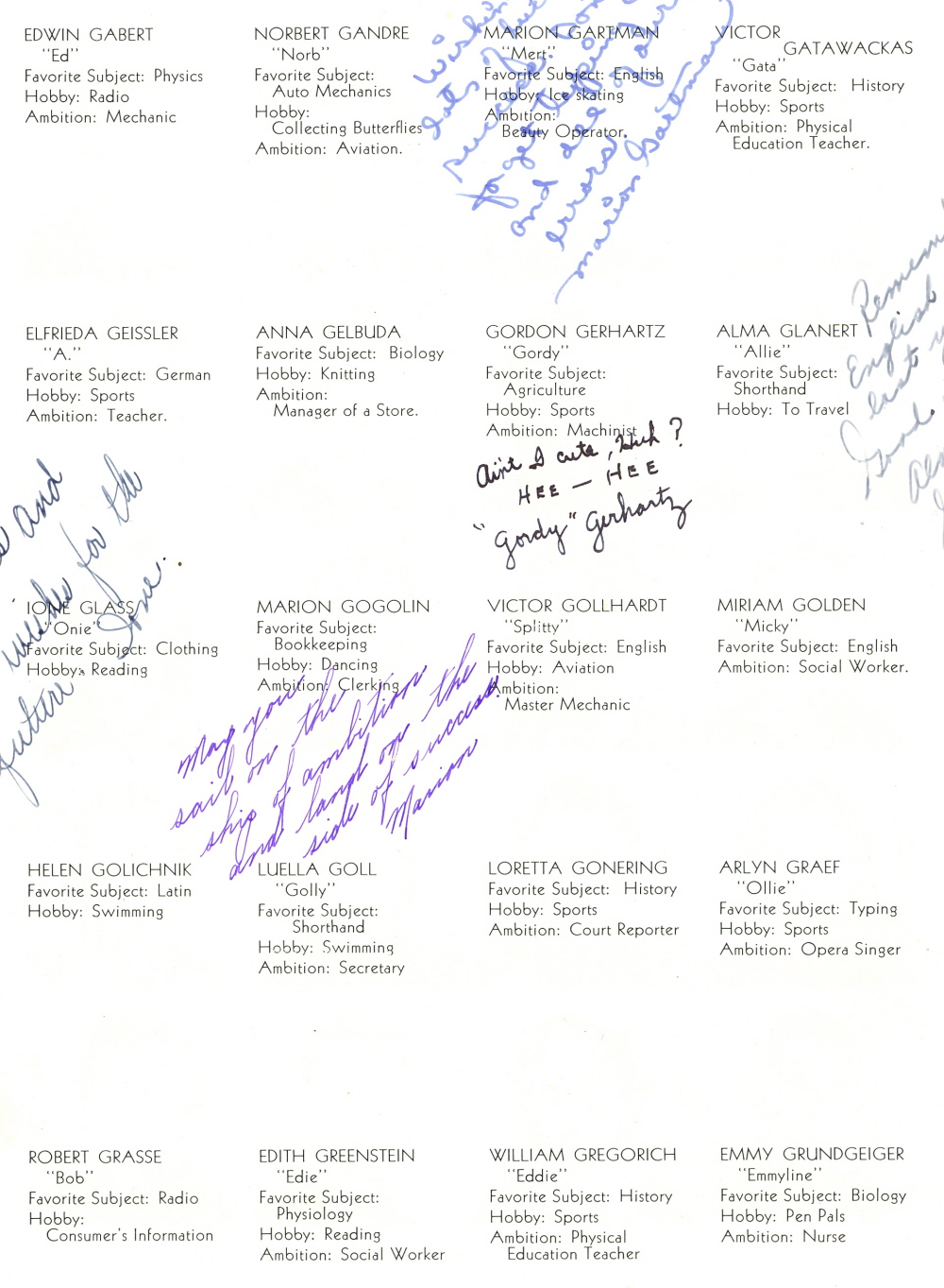 1938 Sheboygan High School, Pages 36 and 37: Edwin Gabert, Norbert Gandre, Marion Gartman, Victor Gatawackas, Elfrieda Geissler, Anna Gelbuda, Gordon Gerhartz, Alma Glanert, Ione Glass, Marion Gogolin, Victor Gollhardt, Miriam Golden, Helen Golichnik, Luella Goll, Loretta Gonering, Arlyn Graef, Robert Grasse, Edith Greenstein, William Gregorich, Emmy Grundgeiger.