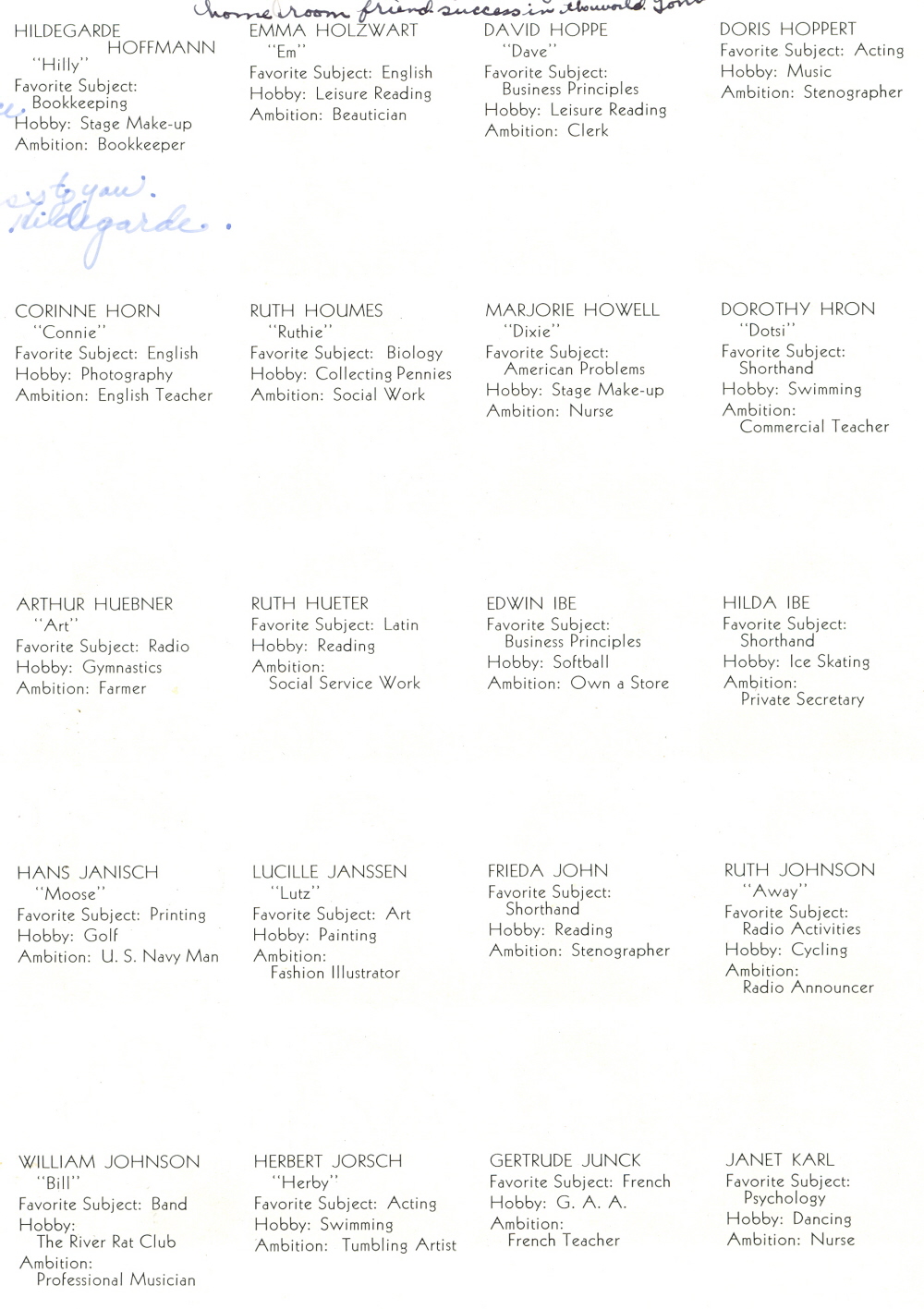 1938 Sheboygan High School, Pages 42 and 43: Hildegarde Hoffmann, Emma Holzwart, David Hoppe, Doris Hoppert, Corinne Horn, Ruth Houmes, Marjorie Howell, Dorothy Hron, Arthur Huebner, Ruth Hueter, Edwin Ibe, Hilda Ibe, Hans Janisch, Lucille Janssen, Frieda John, Ruth Johnson, William Johnson, Herbert Jorsch, Gertrude Junck, Janet Karl.