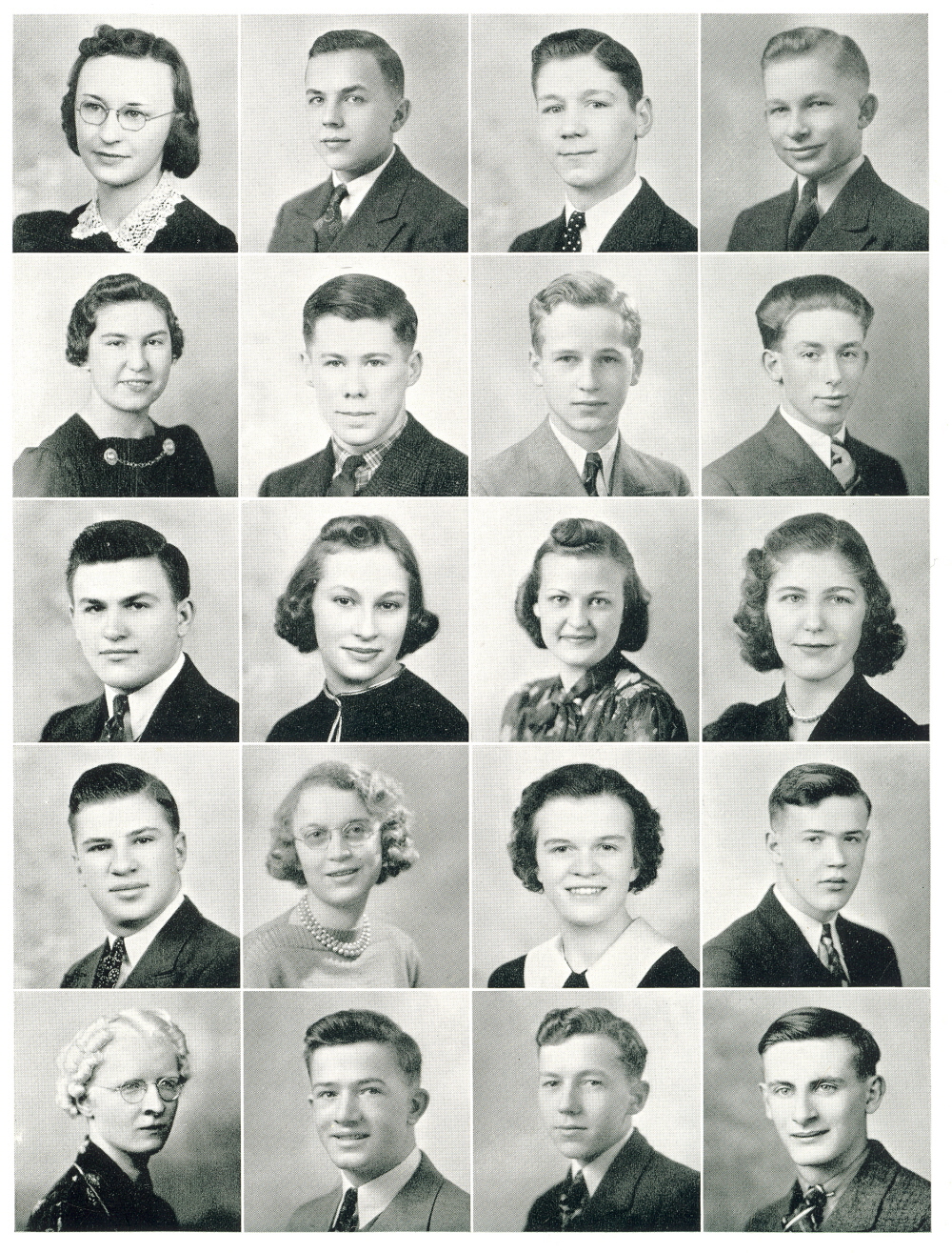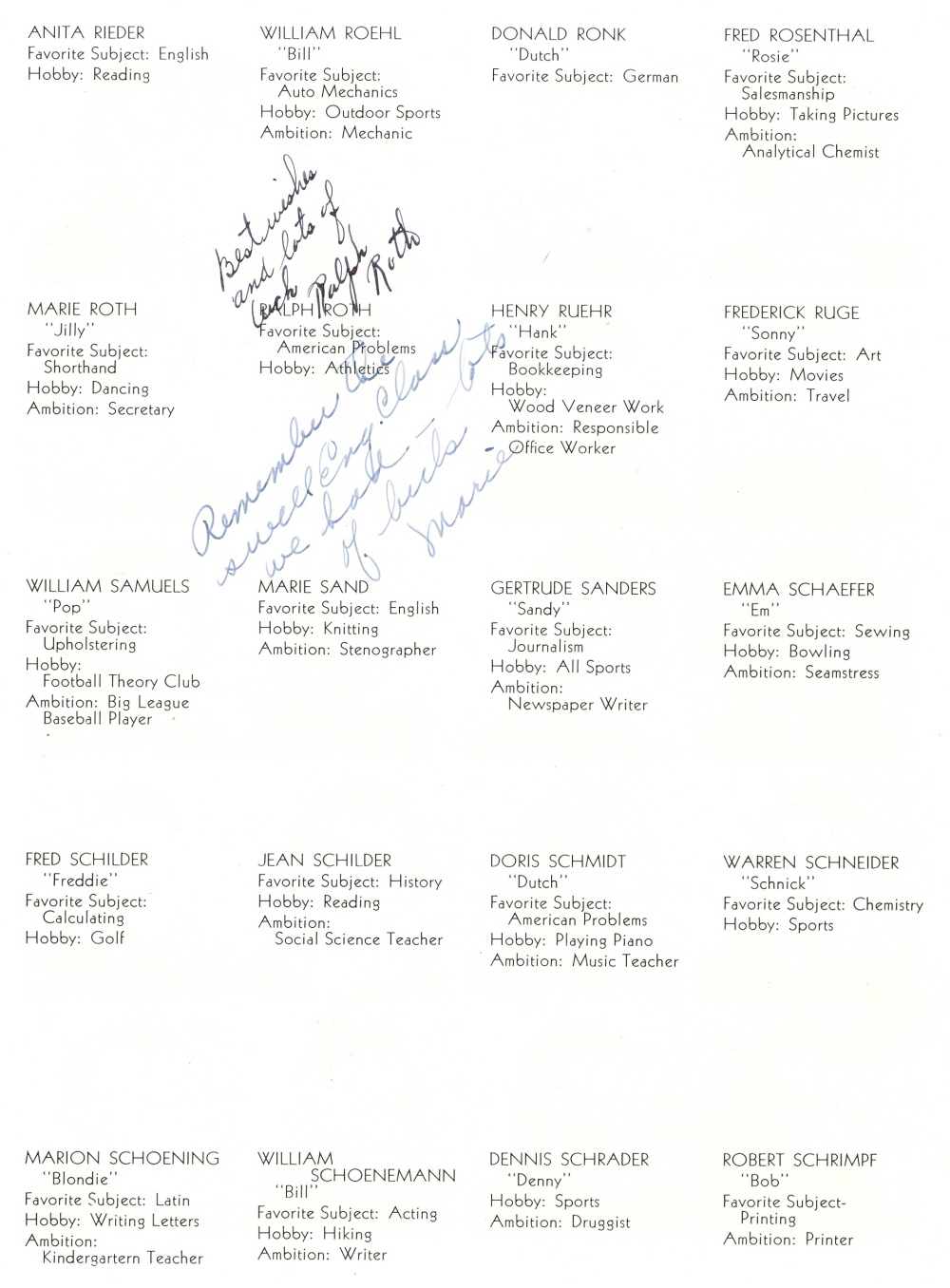 1938 Sheboygan High School, Pages 58 and 59: Anita Rieder, William Roehl, Donald Ronk, Fred Rosenthal, Marie Roth, Ralph Roth, Henry Ruehr, Frederick Ruge, William Sanuels, Marie Sand, Gertrude Sanders, Emma Schaefer, Fred Schilder, Jean Schilder, Doris Schmidt, Warren Schneider, Marion Schoening, William Schoenemann, Dennis Schrader, Robert Schrimpf.