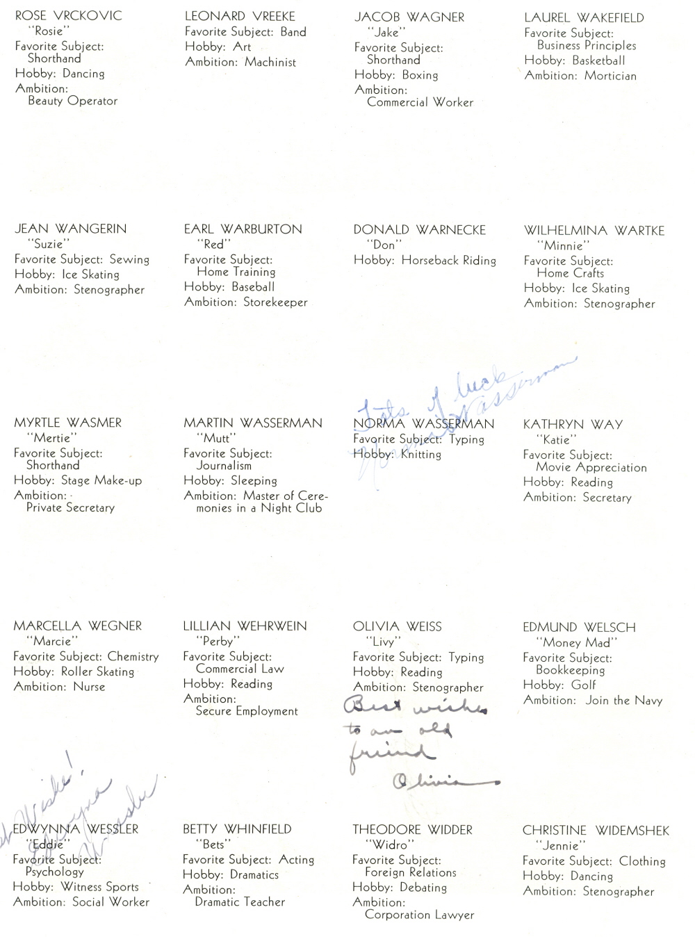 1938 Sheboygan High School, Pages 66 and 67: Rose Vrckovic, Leonard Vreeke, Jacob Wagner, Laurel Wakefield, Jean Wangerin, Earl Warburton, Donald Warnecke, Wilhelmina Wartke, Myrtle Wasmer, Martin Wasserman, Norma Wasserman, Kathryn Way, Marcella Wegner, Lillian Wehrwein, Olivia Weiss, Edmund Welsch, Edwynna Wessler, Betty Whinfield, Theodore Widder, Christine Widemshek.