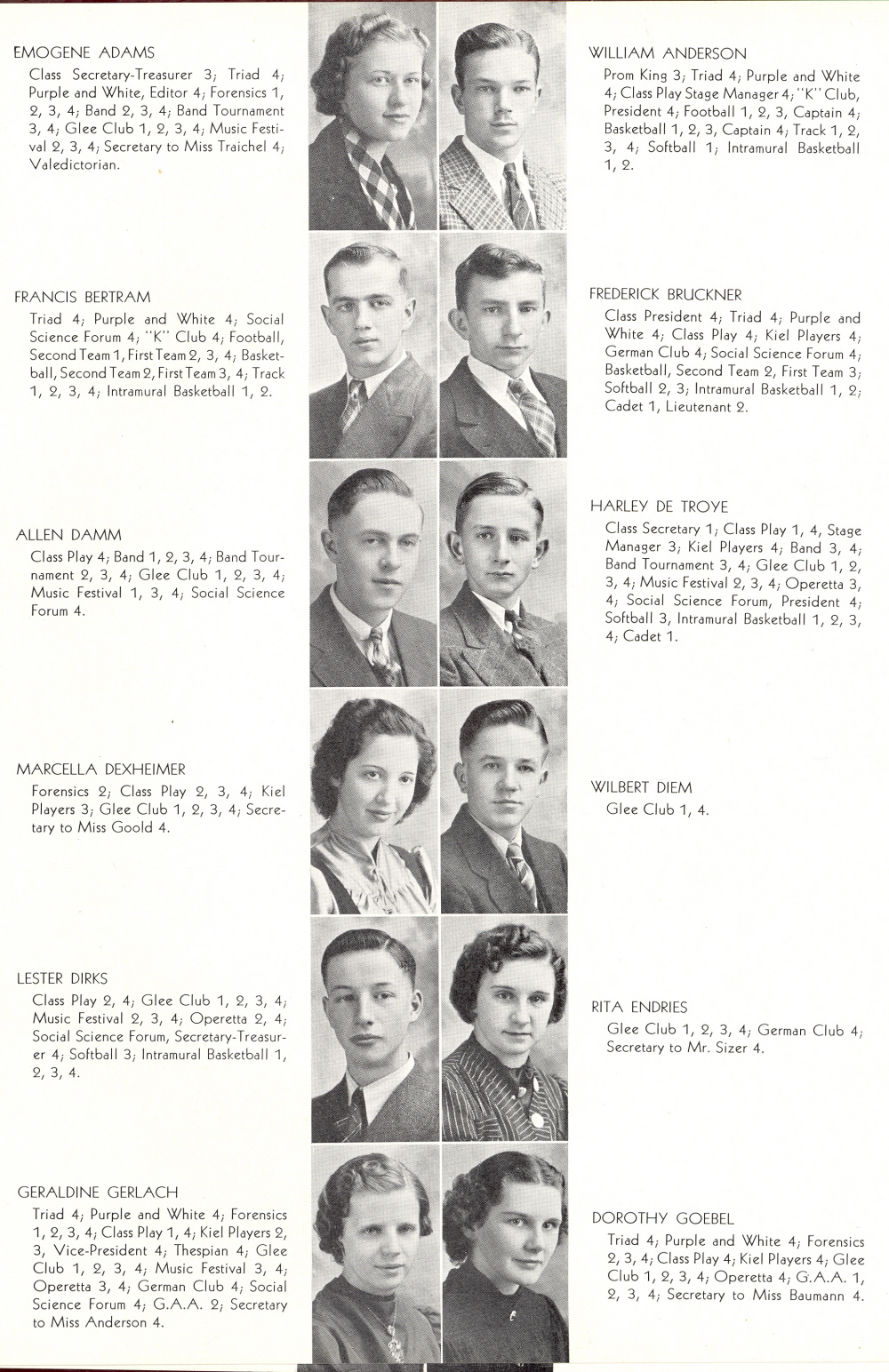 1939 Kiel High School, Page 15: Emogene Adams, William Anderson, Francis Bertram, Frederick Bruckner, Allen Damm, Harley De Troye, Marcella Dexheimer, Wilbert Diem, Lester Dirks, Rita Endries, Geraldine Gerlach, Dorothy Goebel.