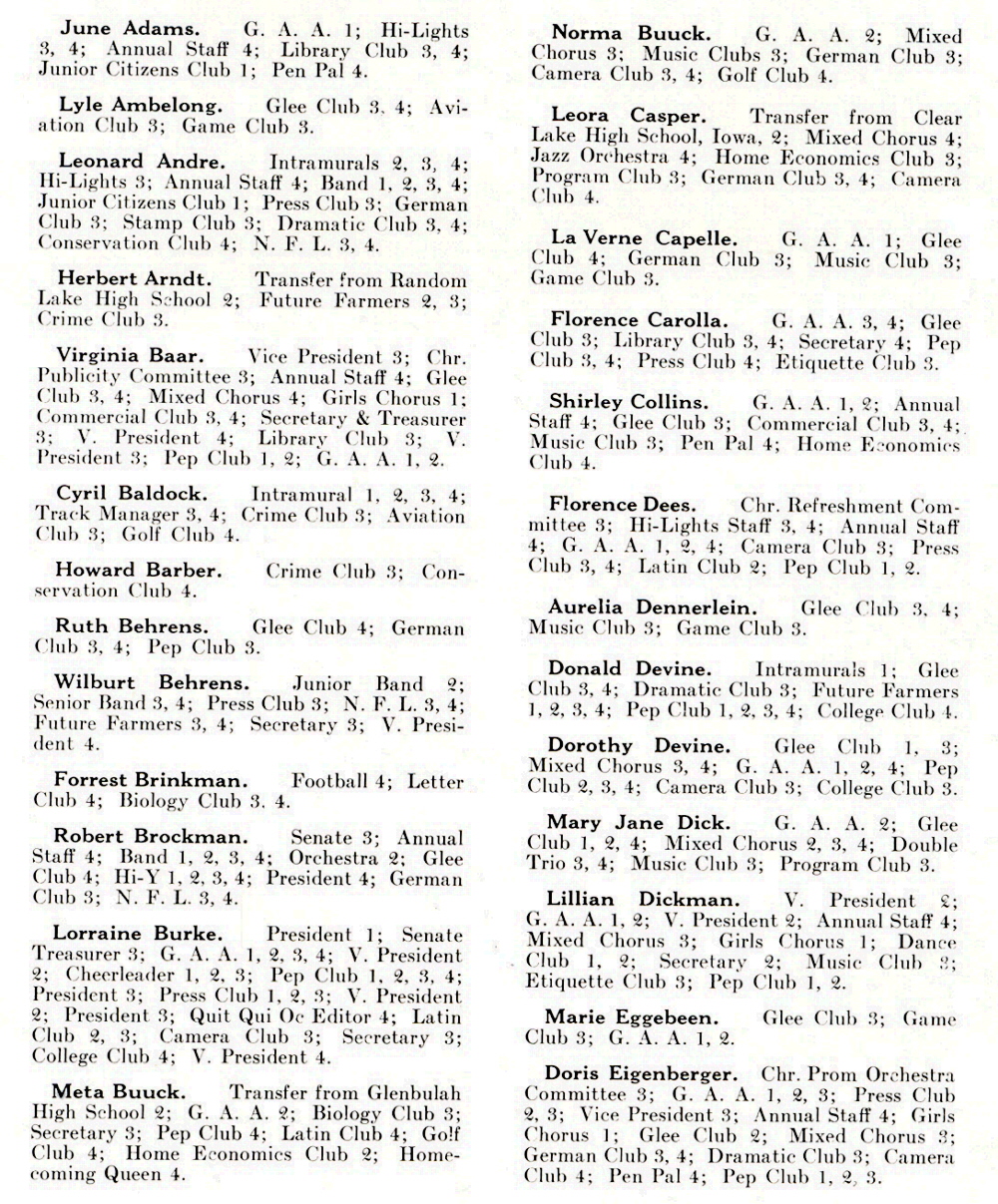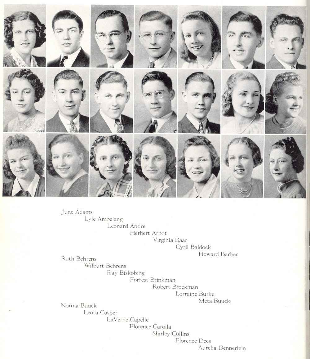 High School, Pages 12 and 20: June Adams, Lyle Ambelang, Leonard Andre, Herbert Arndt, Virginia Baar, Cyril Baldock, Howard Barber, Ruth Behrens, Wilburt Behrens, Ray Biskobing, Forrest Brinkman, Robert Brockman, Lorraine Burke, Meta Buuck, Norma Buuck, Leora Casper, LaVerne Capelle, Florence Carolla, Shirley Collins, Florence Dees, Aurelia Dennerlein.