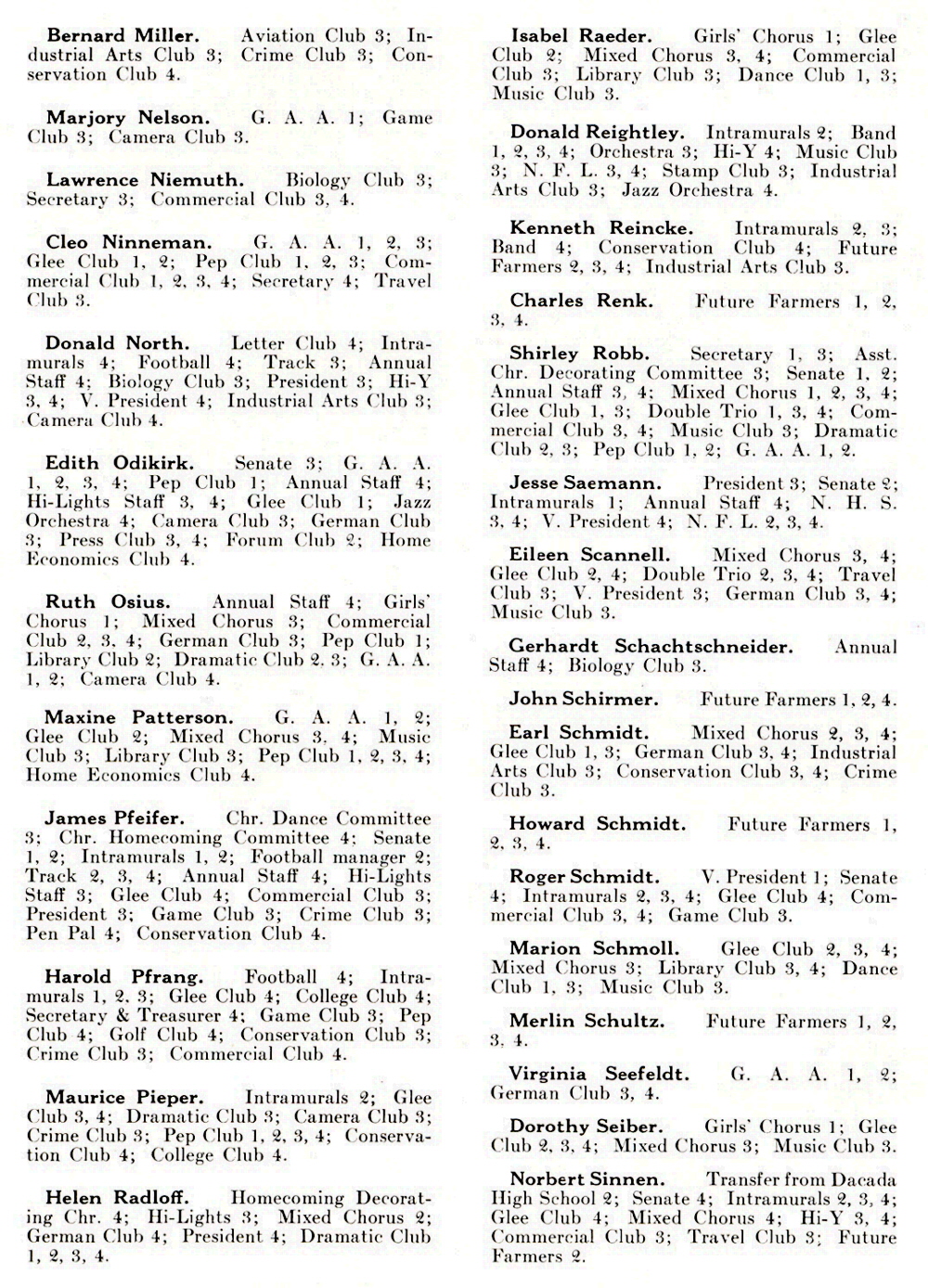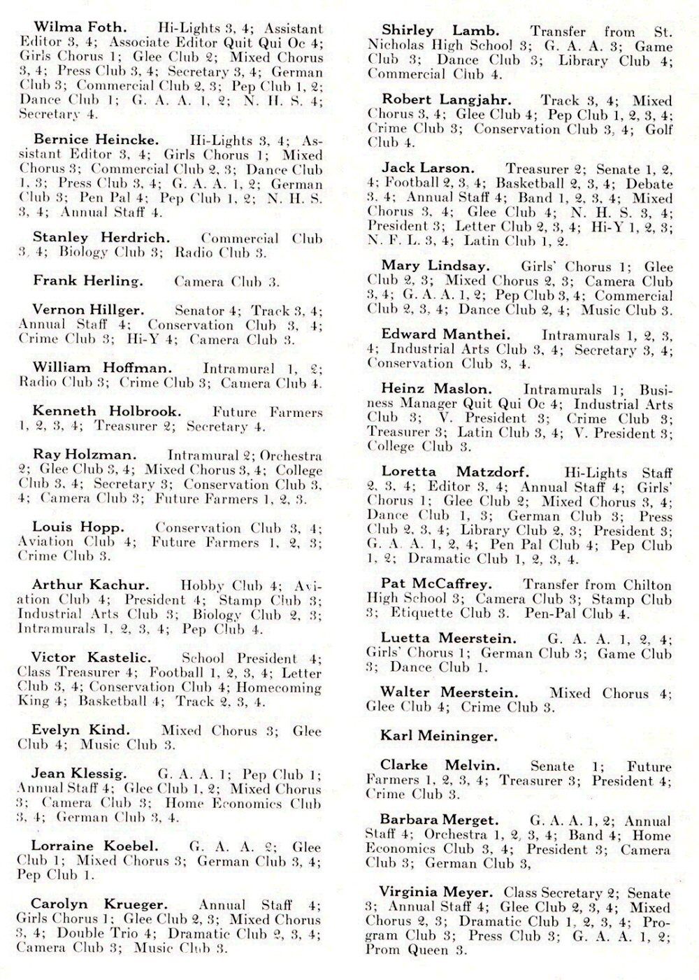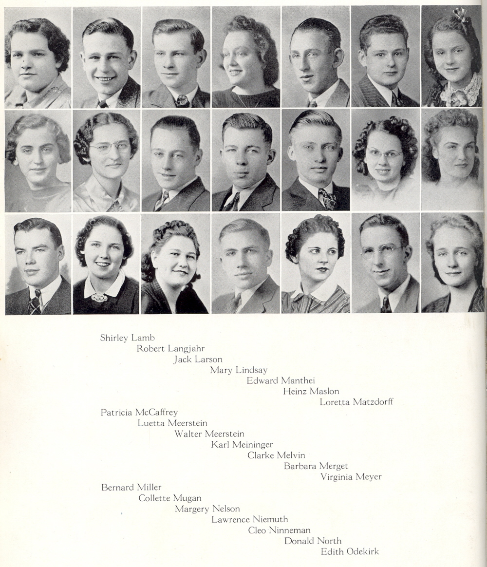 High School, Page 14, 21 and 22: Shirley Lamb, Robert Langjahr, Jack Larson, Mary Lindsay, Edward Manthei, Heinz Maslon, Loretta Matzdorff, Patricia McCaffrey, Luetta Meerstein, Walter Meerstein, Karl Meininger, Clarke Melvin, Barbara Merget, Virginia Meyer, Bernard Miller, Collette Mugan, Margery Nelson, Lawrence Niemuth, Cleo Ninneman, Donald North, Edith Odekirk.