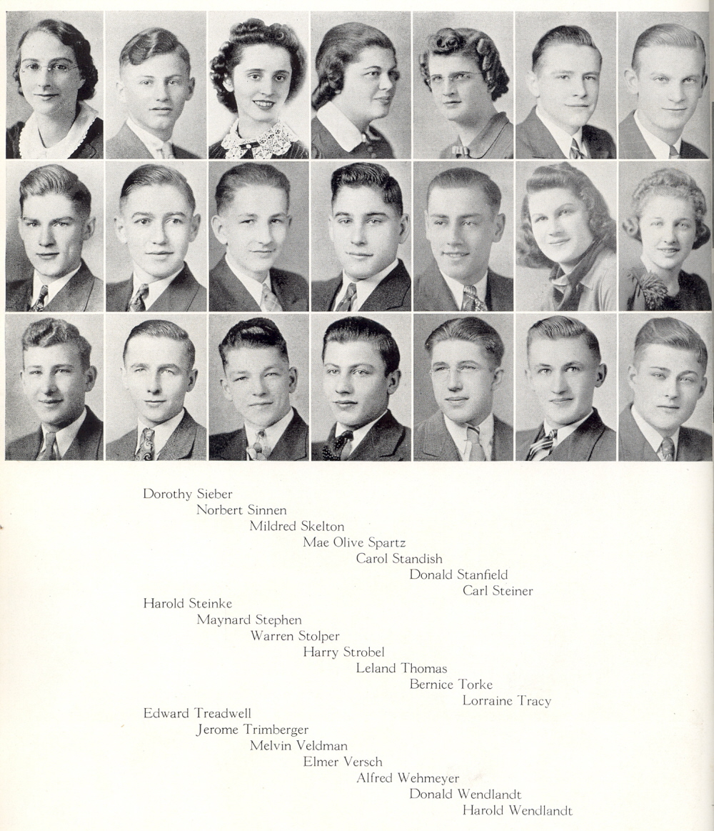 High School, Page 16, 22 and 23: Dorothy Sieber, Norbert Sinnen, Mildred Skelton, Mae Olive Spartz, Carol Standish, Donald Stanfield, Carl Steiner, Harold Steinke, Maynard Stephen, Warren Stolper, Leland Thomas, Bernice Torke, Lorraine Tracy, Edward Treadwell, Jerome Trimberger, Melvin Veldman, Elmer Versch, Alfred Wehmeyer, Donald Wendlandt, Harold Wendlandt.