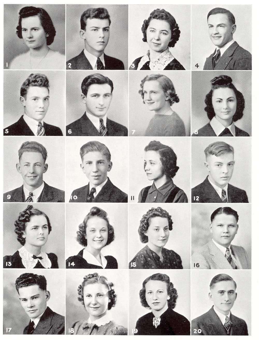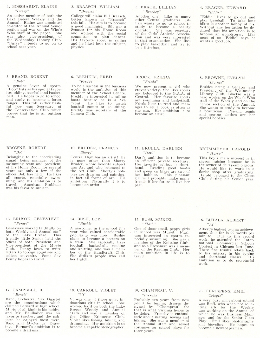 1939 Sheboygan Central High School, Pages 64 and 65: Elaine Bosshardt, William Braasch, Lillian Brack, Edward Brager, Robert Brand, Fred Breheim, Frieda Brock, Evelyn Browne, Robert Browne, Francis Bruder, Darlien Brulla, Harold Brummeyer, Genevieve Brusok, Lois Bush, Muriel Buss, Albert Butala, Bernard Campbell, Violet Carroll, Virginia Champeau, Emil Chrispens.
