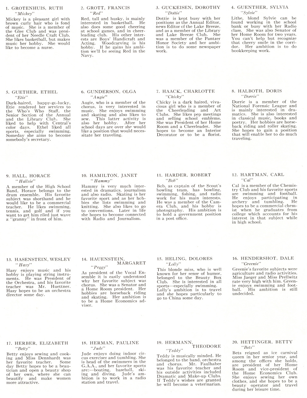 1939 Sheboygan Central High School, Pages 70 and 71: Ruth Grotenhuis, Francis Grott, Dorothy Guckeisen, Sylvia Guenther, Ethel Guenther, Olga Gunderson, Charlotte Haack, Doris Halboth, Horace Hall, Janet Hamilton, Robert Harder, Carl Hartman, Wesley Hasenstein, Margaret Hauenstein, Dolores Heling, Dale Hendershot, Elizabeth Herber, Pauline Herman, Theodore Hermann, Betty Hettinger.