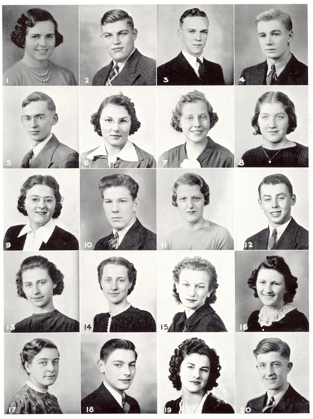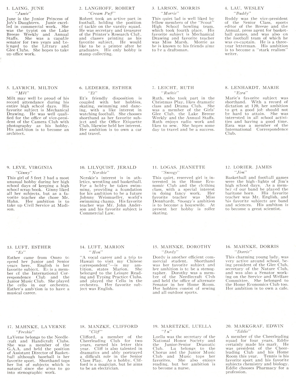 1939 Sheboygan Central High School, Pages 76 and 77: June Laing, Robert Langhoff, Morris Larson, Wesley Lau, Milton Lavrich, Esther Lederer, Ruth Leicht, Marie Lenhardt, Virginia Leve, Jerald Lilyquist, Jeanette Logas, James Lorier, Esther Luft, Marion Luft, Dorothy Mahnke, Dorris Mahnke, La Verne Mahnke, Clifford Manzke, Luella Maretzke, Edwin Markgraf.