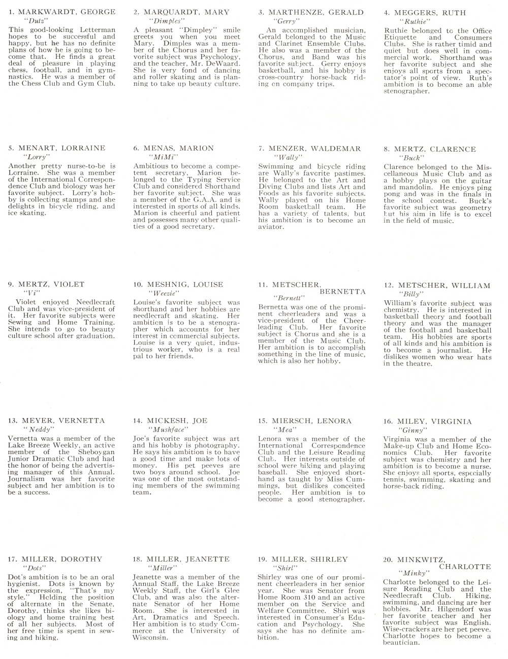 1939 Sheboygan Central High School, Pages 78 and 79: George Markwardt, Mary Marquardt, Gerald Marthenze, Ruth Meggers, Lorraine Menart, Marion Menas, Waldemar Menzer, Clarence Mertz, Violet Mertz, Louise Meshnig, Bernetta Metscher, William Metscher, Vernetta Meyer, Joe Mickesh, Lenora Miersch, Virginia Miley, Dorothy Miller, Jeanette Miller, Shirley Miller, Charlotte Minkwitz.