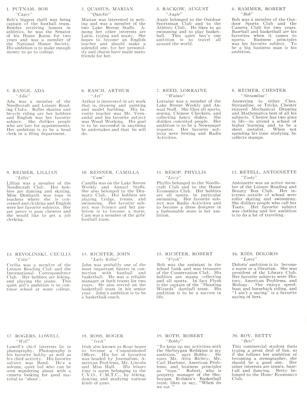 1939 Sheboygan Central High School, Pages 82 and 83: Bob Putnam, Marian Quasius, August Rackow, Robert Rammer, Ada Range, Arthur Rasch, Lorraine Reed, Chester Reimer, Lillian Reimer, Camilla Reisner, Phyllis Resop, Antoinette Retell, Cecilia Revolinski, John Richter, Robert Richter, Dolores Ries, Lowell Rogers, Roger Ross, Robert Roth, Betty Roys.