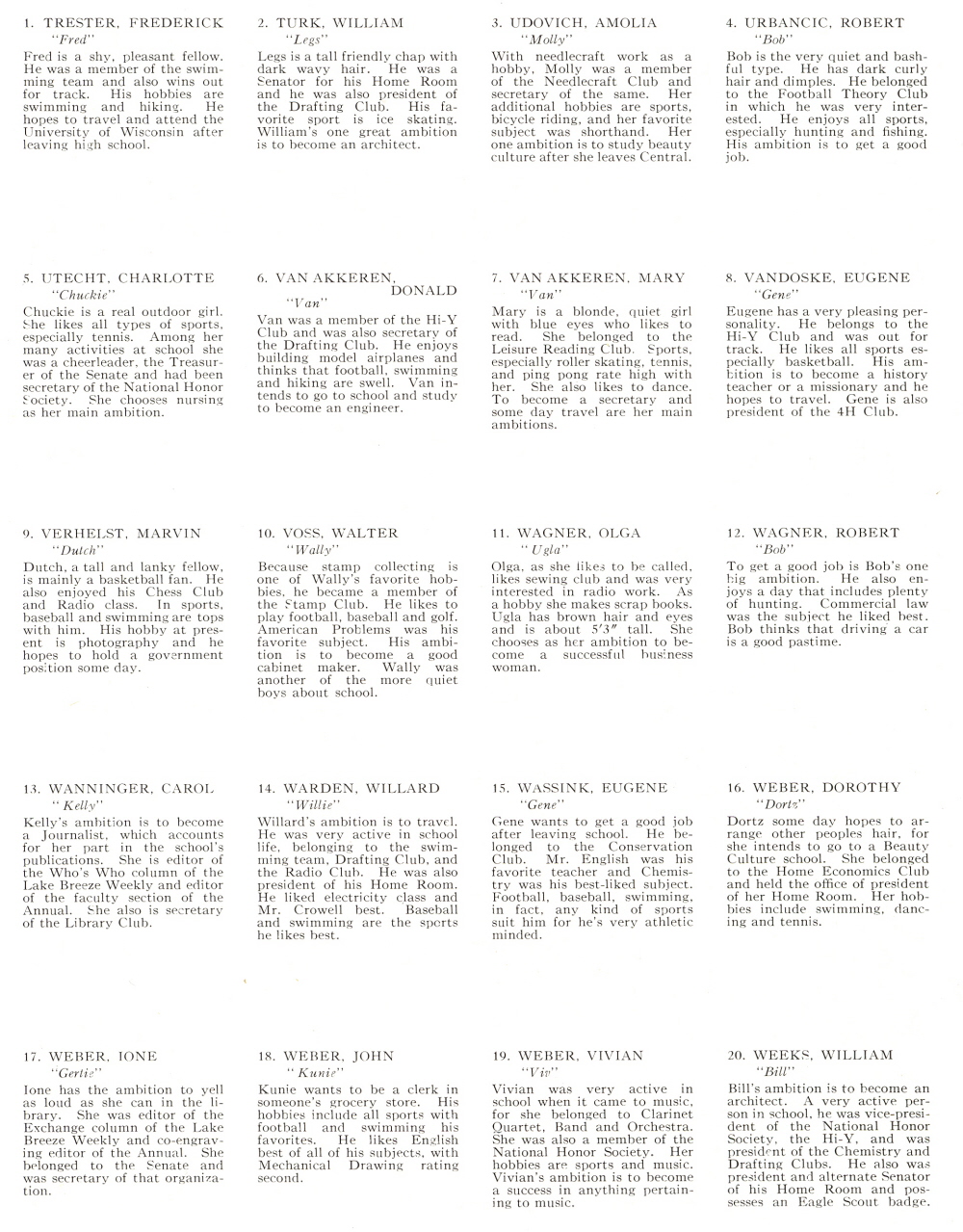1939 Sheboygan Central High School, Pages 90 and 91: Frederick Trester, William Turk, Amolia Udovich, Robert Urbancic, Charlotte Utecht, Donald Van Akkeren, Mary Van Akkeren, Eugene Vandoske, Marvin Verhelst, Walter Voss, Olga Wagner, Robert Wagner, Carol Wanninger, Willard Warden, Eugene Wassink, Dorothy Weber, Ione Weber, John Weber, Vivian Weber, William Weeks.