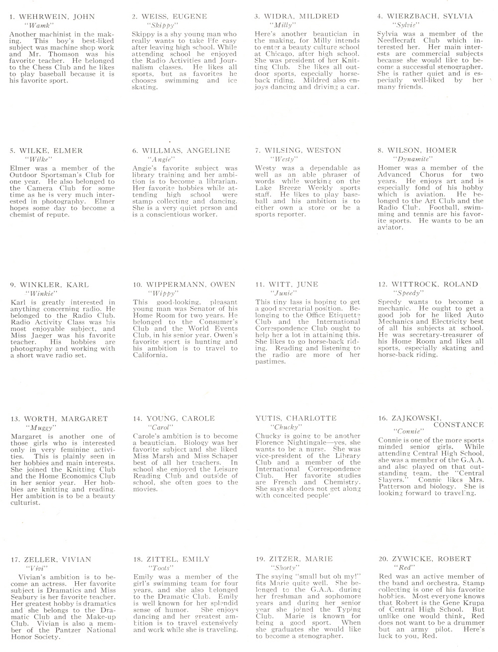 1939 Sheboygan Central High School, Pages 92 and 93: John Wehrwein, Eugene Weiss, Mildred Widra, Sylvia Wierzbach, Elmer Wilke, Angeline Willmas, Weston Wilsing, Homer Wilson, Karl Winkler, Owen Wippermann, June Witt, Roland Wittrock, Margaret Worth, Carole Young, Charlotte Yutis, Constance Zajkowski, Vivian Zeller, Emily Zittel, Marie Zitzer, Robert Zywicks.