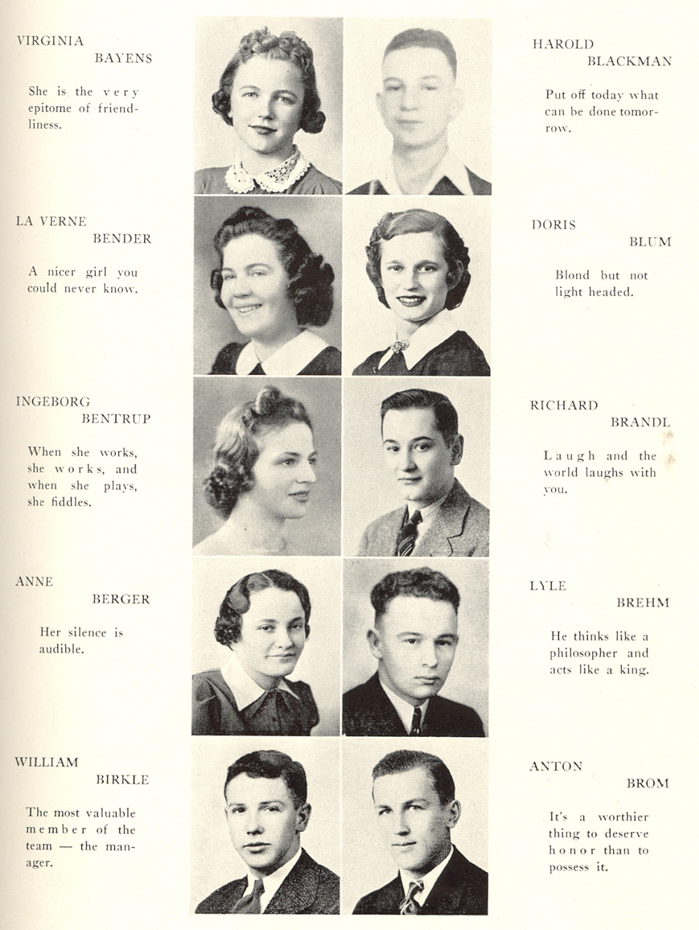 1939 Sheboygan North High School, Page 25: Virginia Bayens, La Verne Bender, Ingeborg Bentrup, Anne Berger, William Birkle, Harold Blackman, Doris Blum, Richard Brandl, Lyle Brehm, Anton Brom.