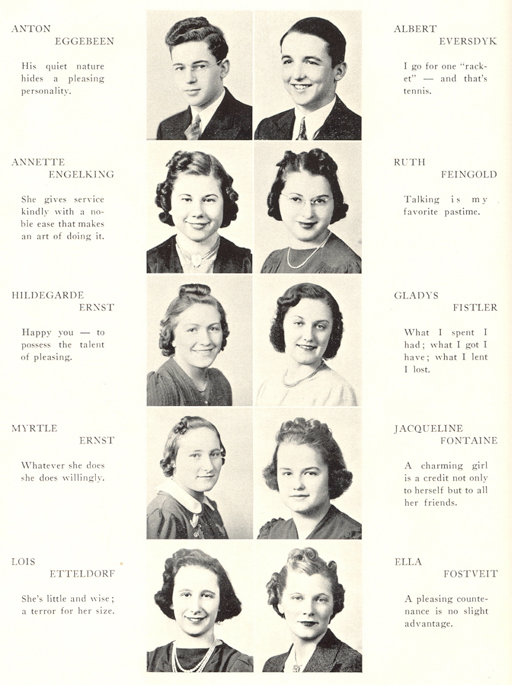 1939 Sheboygan North High School, Page 28: Anton Eggebeen, Annette Engelking, Hildegarde Ernst, Myrtle Ernst, Lois Etteldorf, Albert Eversdyk, Ruth Feingold, Gladys Fistler, Jacqueline Fontaine, Ella Fostveit.