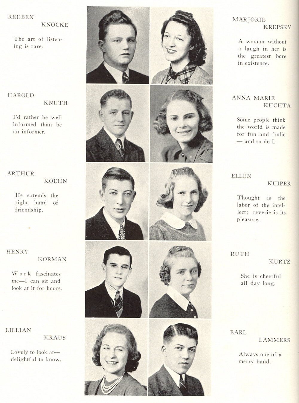 1939 Sheboygan North High School, Page 34: Reuben Knocke, Harold Knuth, Arthur Koehn, Henry Korman, Lillian Kraus, Marjorie Krepsky Anna Marie Kuchta, Ellen Kuiper, Ruth Kurtz, Earl Lammers.