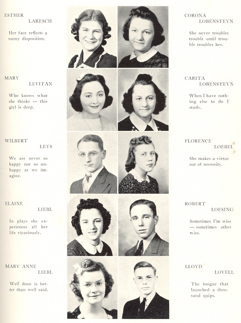 1939 Sheboygan North High School, Page 35: Esther Laresch, Mary Levitan, Wilbert Leys, Elaine Liebl, Mary Anne Liebl, Corona Lobensteyn, Carita Lobensteyn, Florence Loebel, Robert Loesing, Lloyd Lovell.