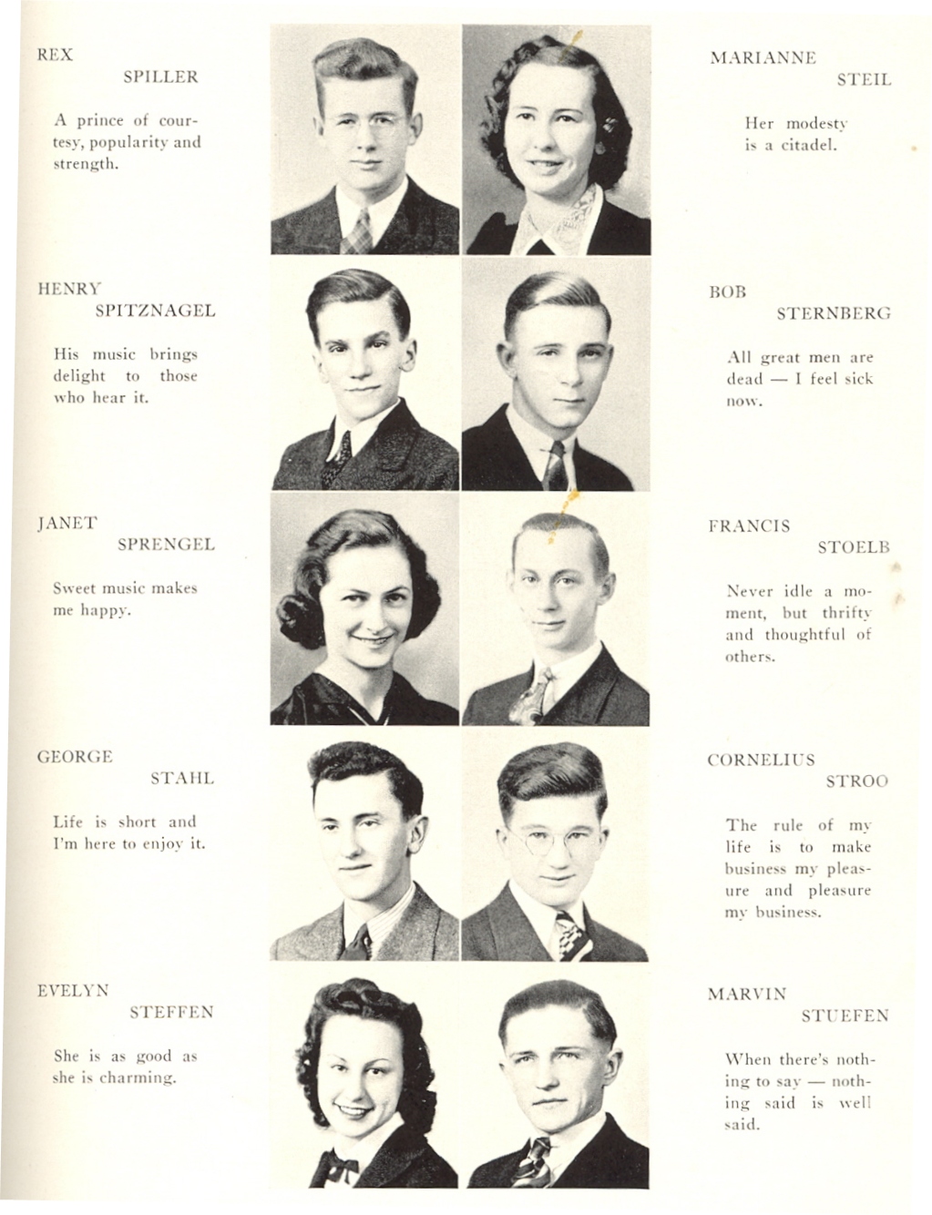 1939 Sheboygan North High School, Page 43: Rex Spiller, Henry Spitznagel, Janet Sprengel, George Stahl, Evelyn Steffen, Marianne Steil, Bob Sternberg, Francis Stoelb, Cornelius Stroo, Marvin Stuefen.