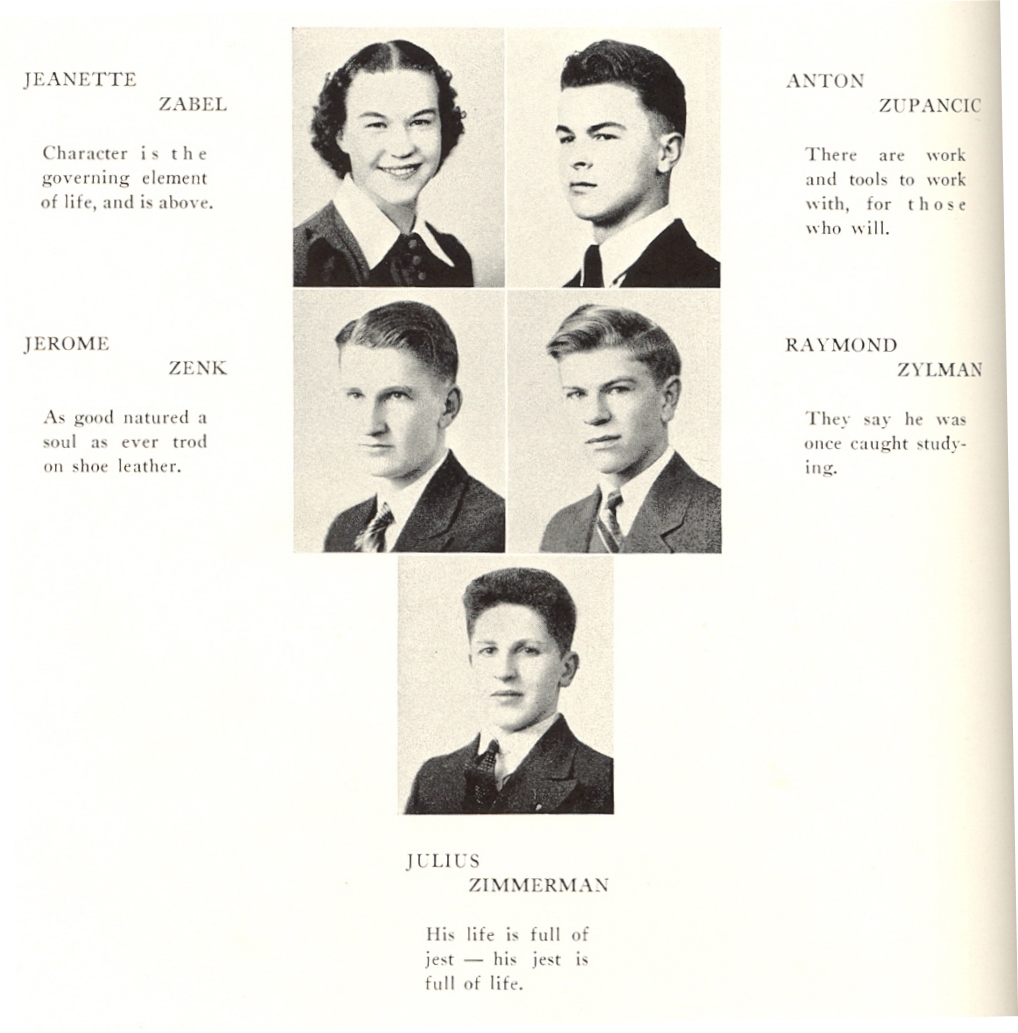 1939 Sheboygan North High School, Page 48: Jeanette Zabel, Jerome Zenk, Anton Zupancic, Raymond Zylman, Julius Zimmerman.