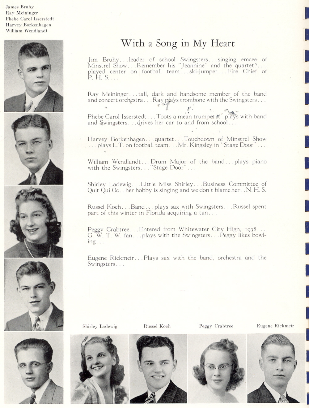 1940 Plymouth High School, Page 60: Jim Bruhy, Ray Meininger, Phebe Carol Isserstedt, Harvey Borkenhagen, William Wendlandt, Shirley Ladewig, Russel Koch, Peggy Crabtree, Eugene Rickmeir.