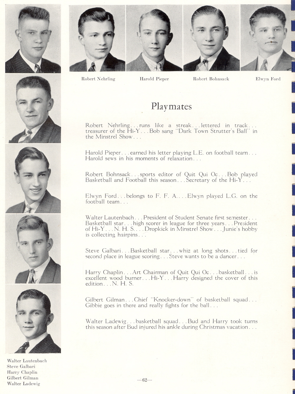 1940 Plymouth High School, Page 62: Robert Nehrling, Harold Pieper, Robert Bohnsack, Elwyn Ford, Walter Lautenbach, Steve Galbari, Harry Chaplin, Gilbert Gilman, Walter Ladewig.