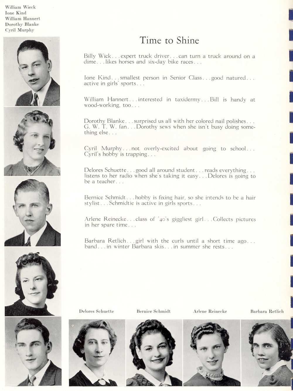 1940 Plymouth High School, Page 64: Billy Wick, Ione Kind, William Hannert, Dorothy Blanke, Cyril Murphy, Delores Schuette, Bernice Schmidt, Arlene Reinecke, Barbara Retlich.