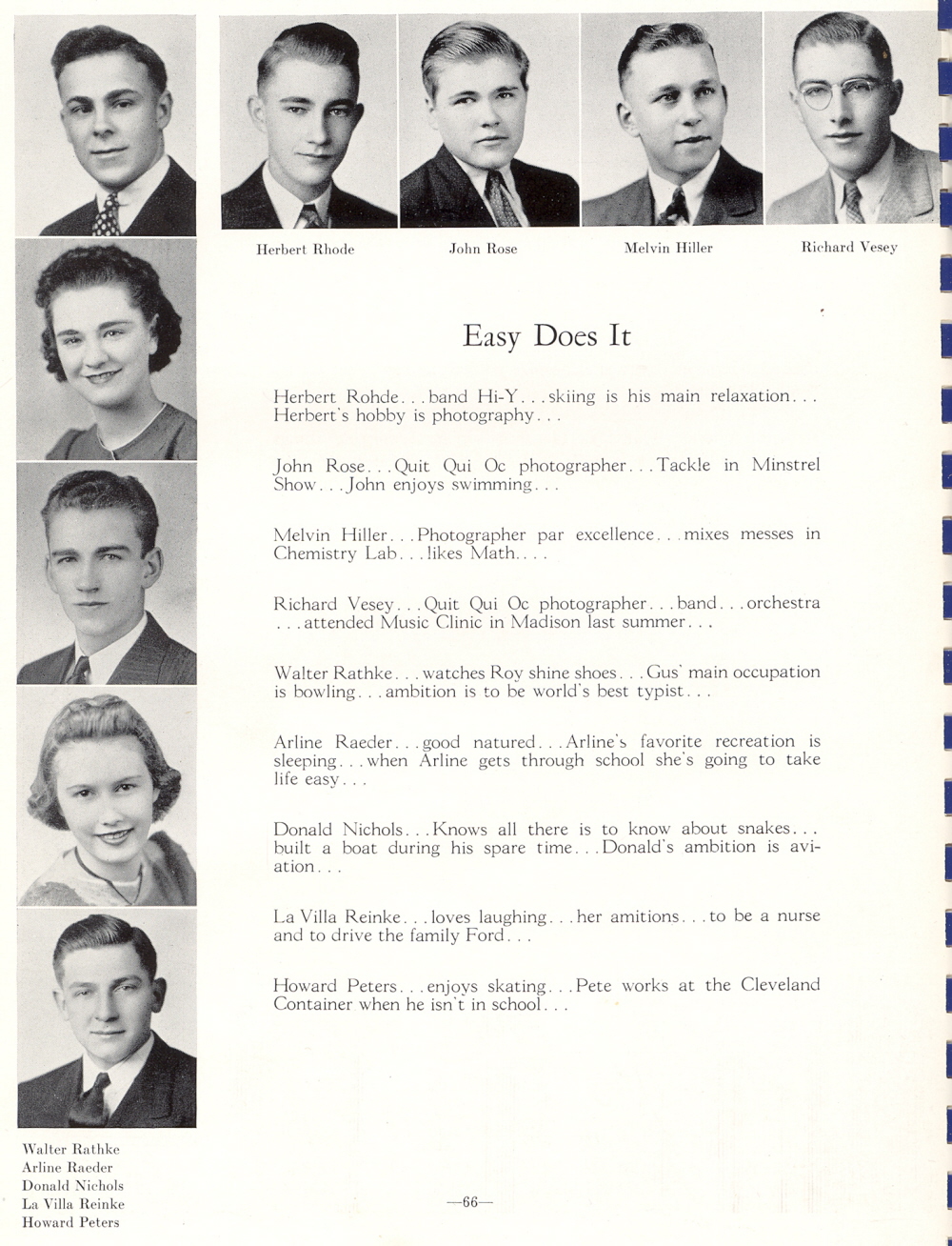 1940 Plymouth High School, Page 66: Herbert Rohde, John Rose, Melvin Hiller, Richard Vesey, Walter Rathke, Arline Raeder, Donald Nichols, La Villa Reinke, Howard Peters.